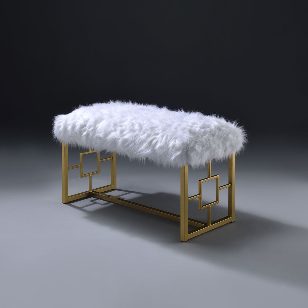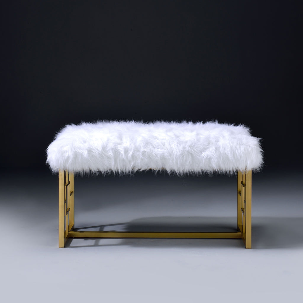 This sleek and contemporary bench features a white faux fur upholstered seat, offering a soft and cozy surface ideal for lounging. The faux fur not only adds texture and warmth but also contrasts beautifully with the gleaming gold metal legs, enhancing its glam and elegant appearance in any room.