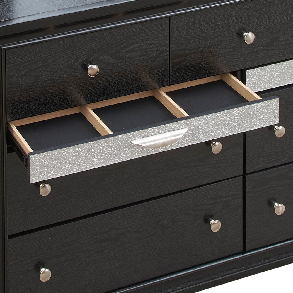 With dimensions of 39 inches high, 63 inches wide, and 17 inches deep, this dresser optimizes your storage needs without taking up too much visual space. The elegant acrylic silver trim elevates the dresser's design while remaining easy to maintain, providing an inviting aesthetic for any bedroom. Durable nickel handles complete the design, offering a contemporary touch while resisting tarnishing over time.