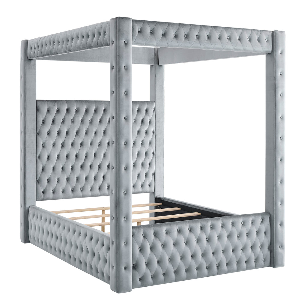 This majestic four-poster bed is a statement piece that exudes luxury and grandeur, perfect for creating a dramatic bedroom setting. It boasts a bold gray finish that encapsulates modern opulence, while its sumptuous, tufted headboard and footboard are upholstered in a rich velvet fabric that offers an indulgent tactile experience.
