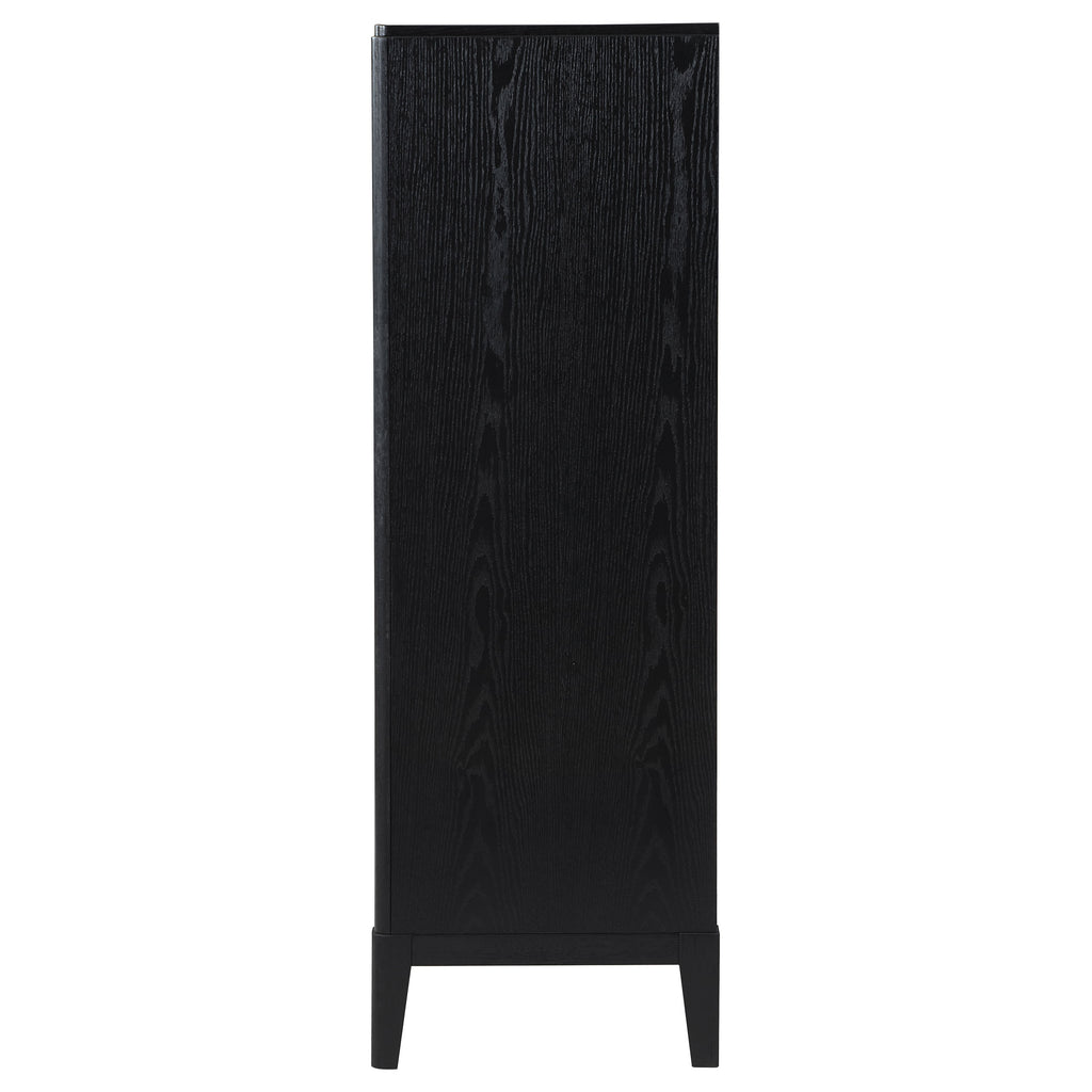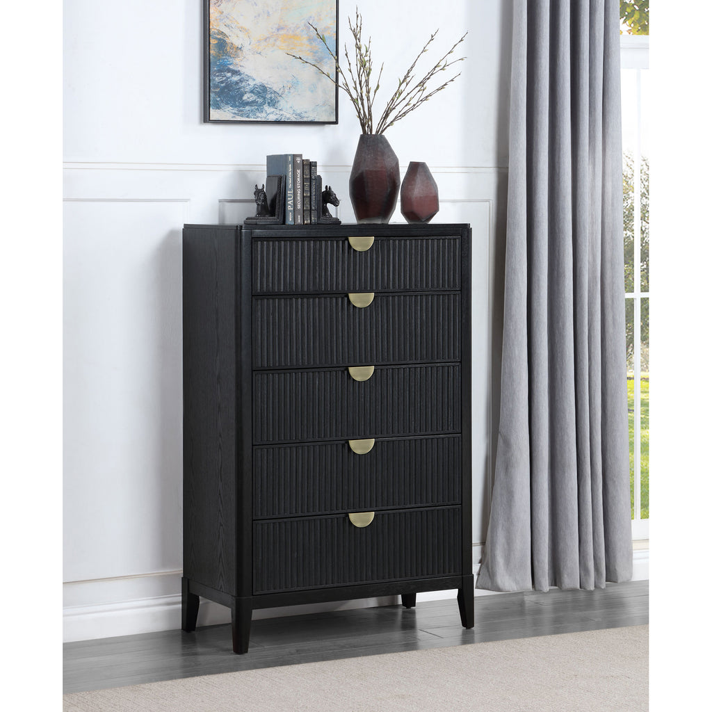 A compact footprint pairs with plentiful storage in a modern five-drawer chest that showcases decorative fluted details and bold hardware. Its black finish is rich and refined, while demi-lune pulls in an antique brass tone add warmth and sophistication to ample interior storage.