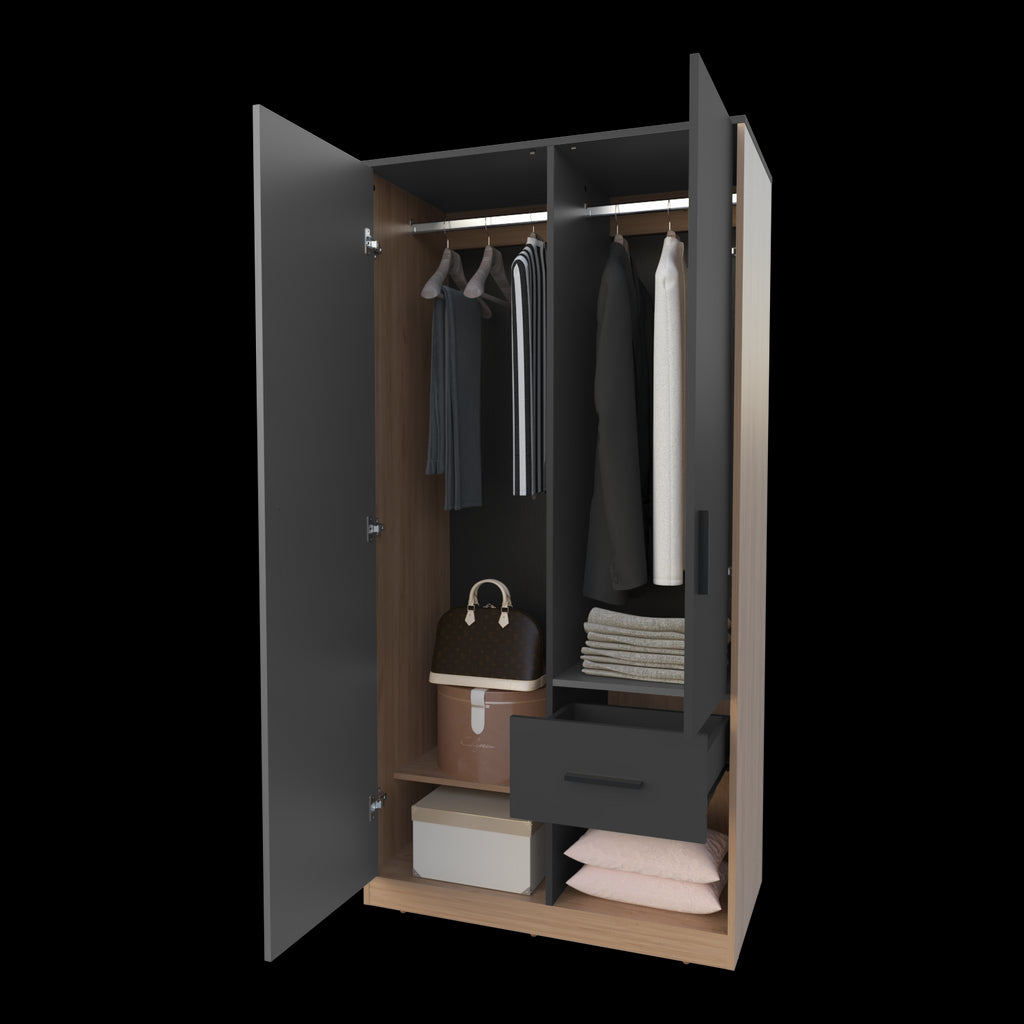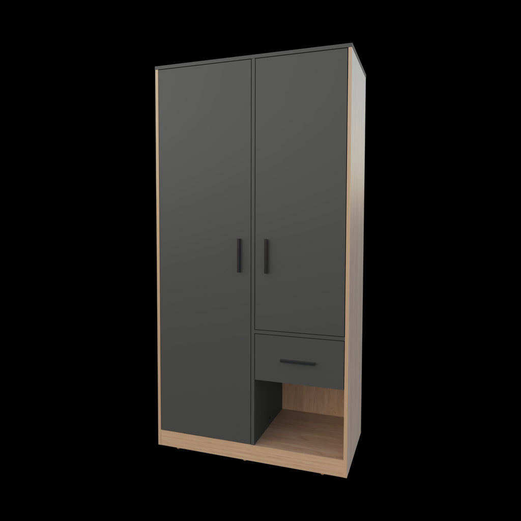 This modern two-tone unit in matte grey and natural oak combines sleek 2-door enclosed storage and a smooth-gliding drawer for organized, hidden essentials. Open compartments provide easy access and stylish display space, making it a functional and contemporary addition to your bedroom décor.
