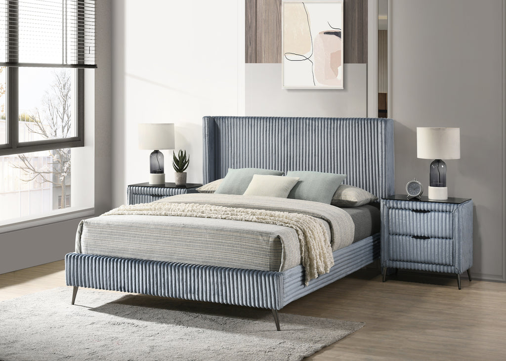 Transform your bedroom into a sanctuary of style and comfort with the Mavela Bedroom Set, featuring a king or queen-sized bed and two matching nightstands. The bed is upholstered in soft wide wale corduroy fabric in a chic blue color, offering a plush and inviting texture. The elegant wing back style headboard adds a touch of modern sophistication, while the sturdy construction ensures durability and long-lasting use. Complementing the bed are two matching Mavela nightstands, each featuring the same luxurious wide wale corduroy upholstery and blue color. These nightstands provide ample storage with their two spacious drawers, perfect for keeping your bedside essentials organized and within reach.