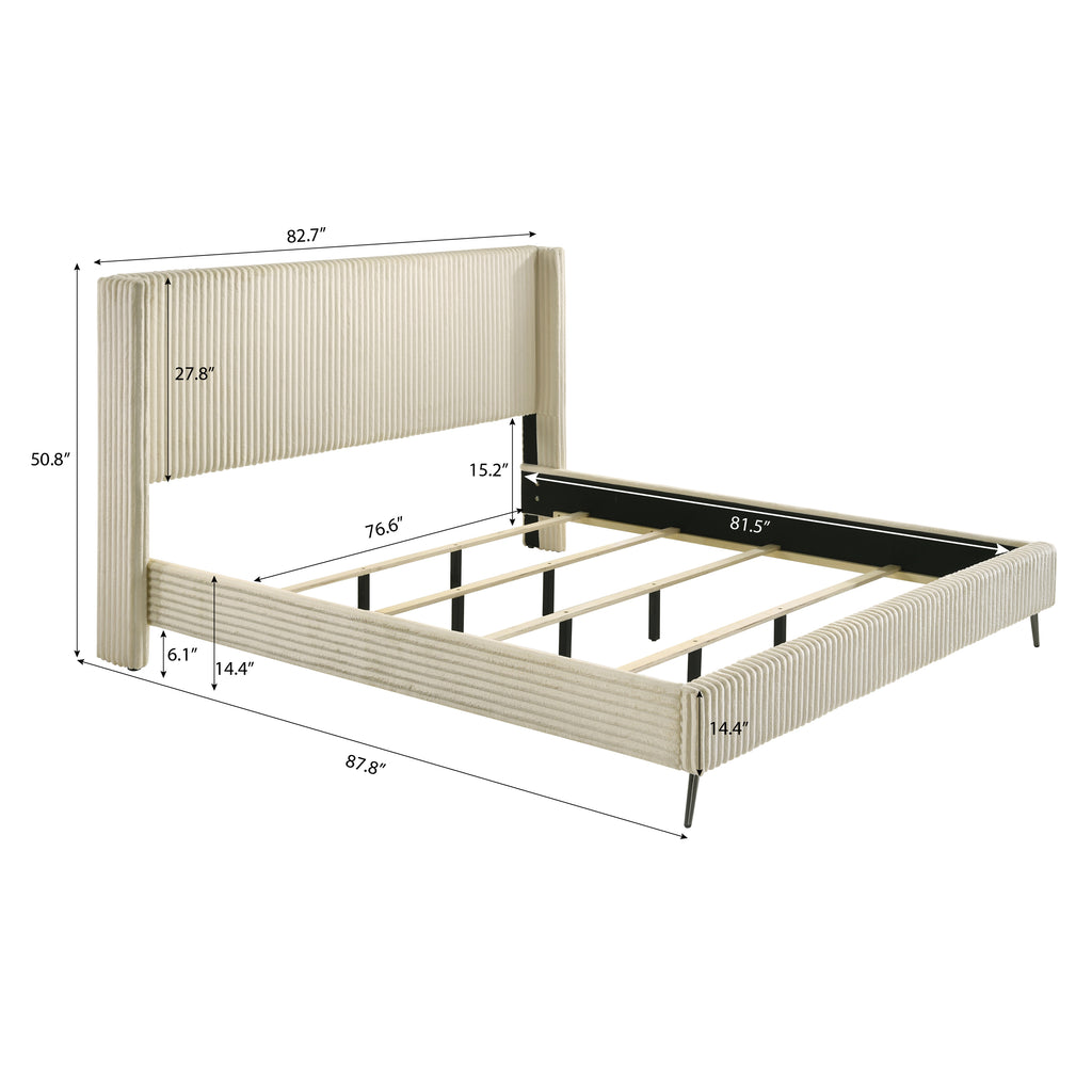 Transform your bedroom into a luxurious haven with the Mavela King/Queen Bed Collection. Available in both king and queen sizes, this stunning panel bed combines modern design with ultimate comfort, making it the perfect centerpiece for any contemporary bedroom decor. Wrapped in soft wide wale corduroy upholstery in a soothing cream color, the Mavela bed offers a luxurious texture that enhances both comfort and aesthetic appeal. The sleek and modern style of the Mavela bed complements contemporary bedroom decor, creating a stylish and inviting atmosphere that you'll love coming home to. The distinctive wing back style headboard not only adds an elegant touch but also provides a comfortable backrest for reading or relaxing in bed.
