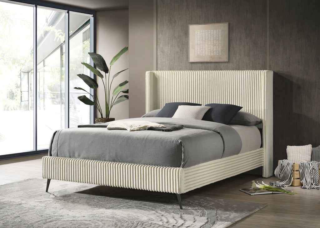Transform your bedroom into a sanctuary of style and comfort with the Mavela Bedroom Set, featuring a king or queen-sized bed, two matching nightstands, and a stylish bench. The bed is upholstered in soft wide wale corduroy fabric in a chic cream color, offering a plush and inviting texture. The elegant wing back style headboard adds a touch of modern sophistication, while the sturdy construction ensures durability and long-lasting use. Complementing the bed are two matching Mavela nightstands, each featuring the same luxurious wide wale corduroy upholstery and cream color. These nightstands provide ample storage with their two spacious drawers, perfect for keeping your bedside essentials organized and within reach. The Mavela accent bench is a versatile addition that enhances both style and functionality. It provides a comfortable seating option that can be placed at the foot of the bed or used as an accent piece in your bedroom or hallway.