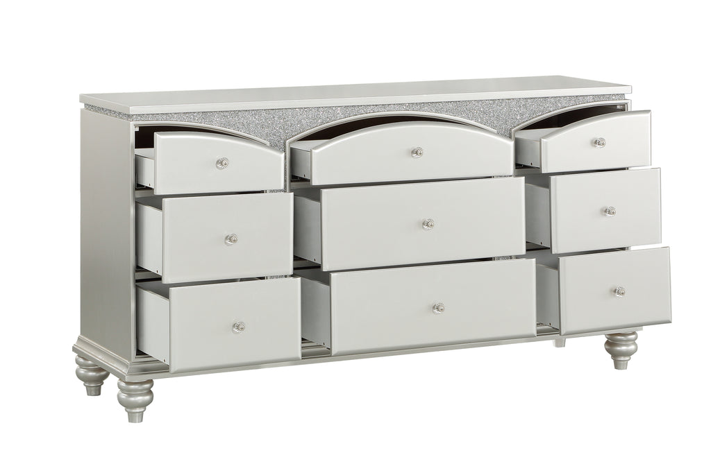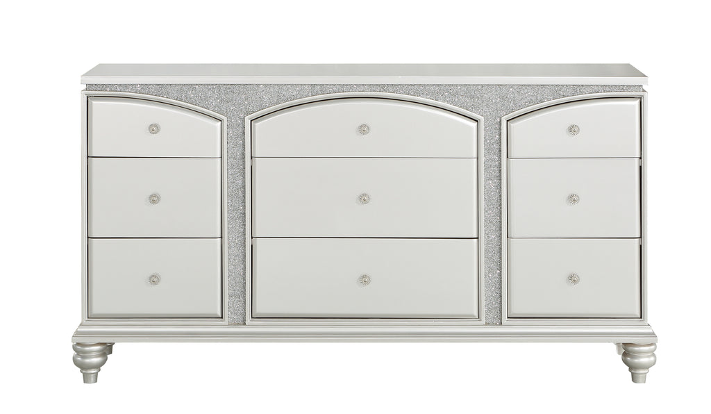 - This exquisite platinum dresser is a perfect blend of elegance and functionality, featuring nine spacious drawers for ample storage.