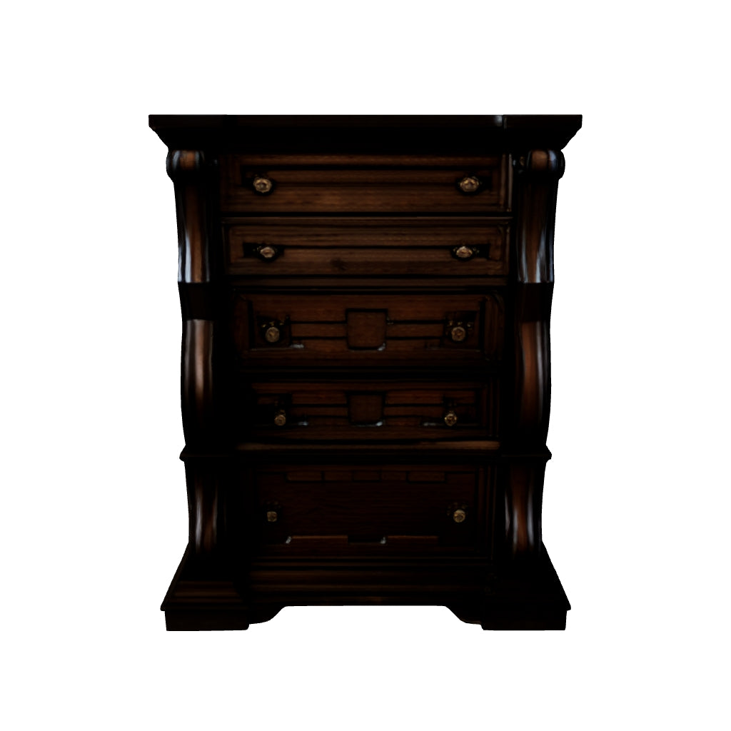 From its ornamental appliques to its large scale, this chest of drawers makes a bold statement. Spacious drawers store your clothes and more in stunning style. The look is timeless. The feel? Right at home.
