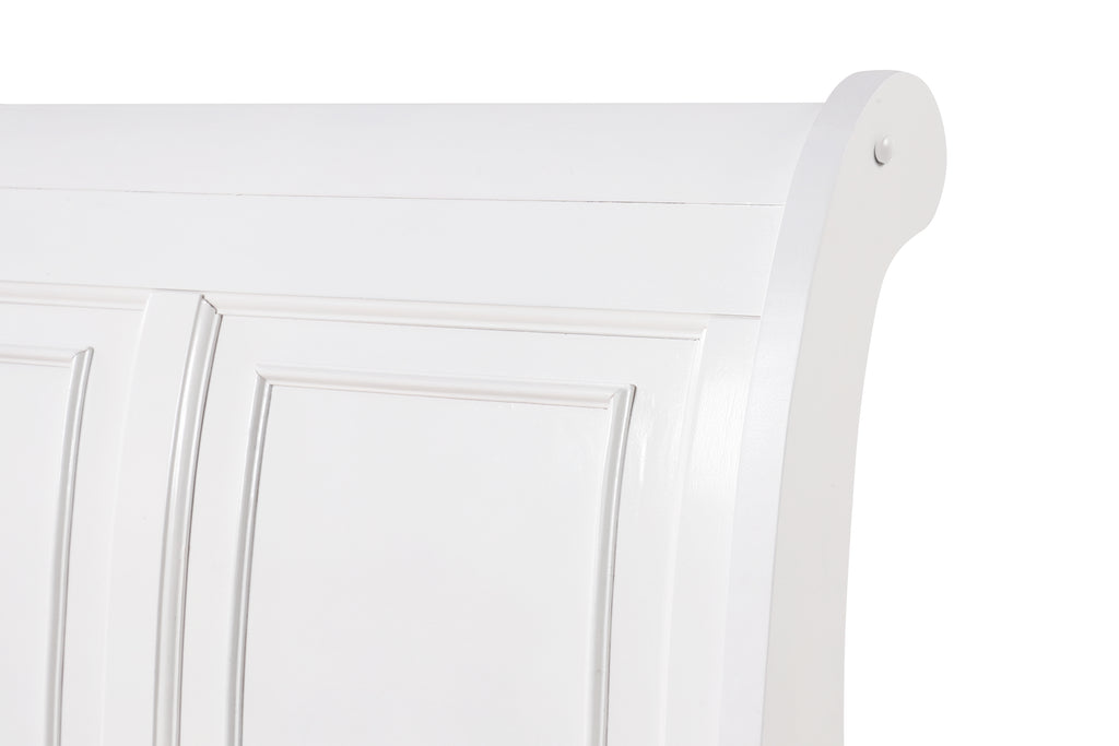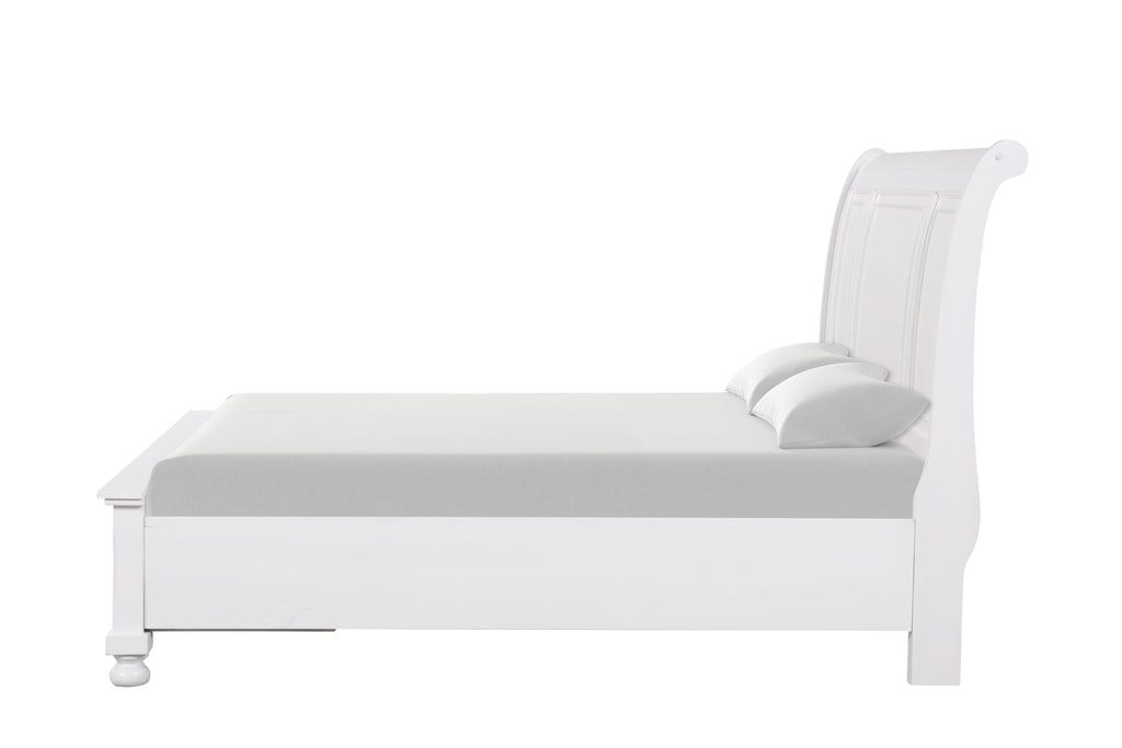- The crisp white finish of the bed harmoniously blends with various bedroom styles.