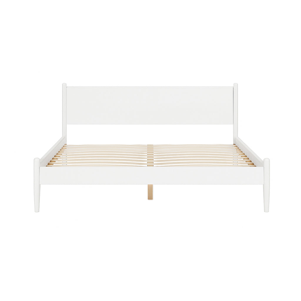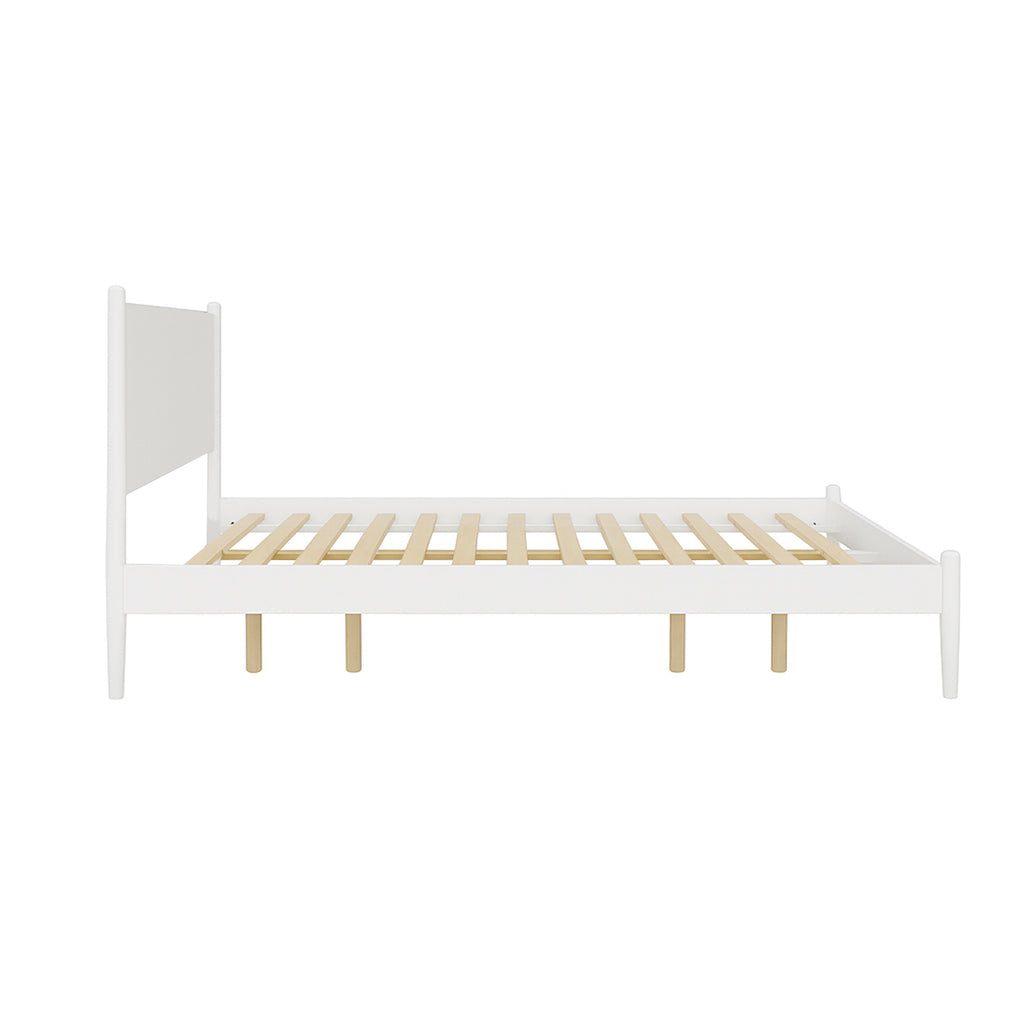 Add a touch of timeless elegance to your bedroom with this Mid-Century platform bed, featuring a white finish and clean, tapered lines that complement both modern and classic interiors. Crafted from durable solid wood and engineered wood, it offers exceptional strength and longevity, while the tall headboard provides comfortable back support for reading or relaxing. The slatted base eliminates the need for a box spring, promoting better airflow and mattress support. Easy to assemble and designed for both style and practicality, this platform bed is the perfect centerpiece for any bedroom retreat.