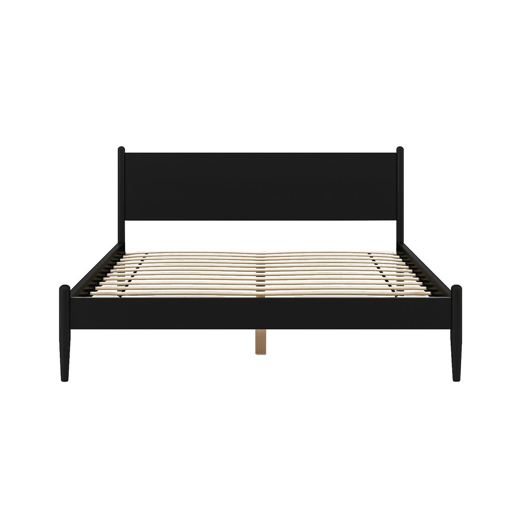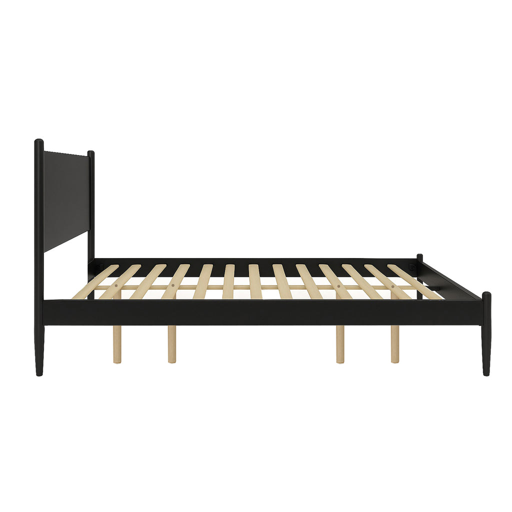 Upgrade your bedroom with the striking simplicity of this Mid-Century modern platform bed, crafted from solid wood and finished in a rich matte black for a bold, refined look. Designed with a spacious California King frame, it features clean lines, slightly tapered legs, and a tall, smooth headboard that adds height and elegance to your space. The supportive slatted platform eliminates the need for a box spring while improving airflow and mattress life, making this bed both functional and effortlessly stylish for modern living.