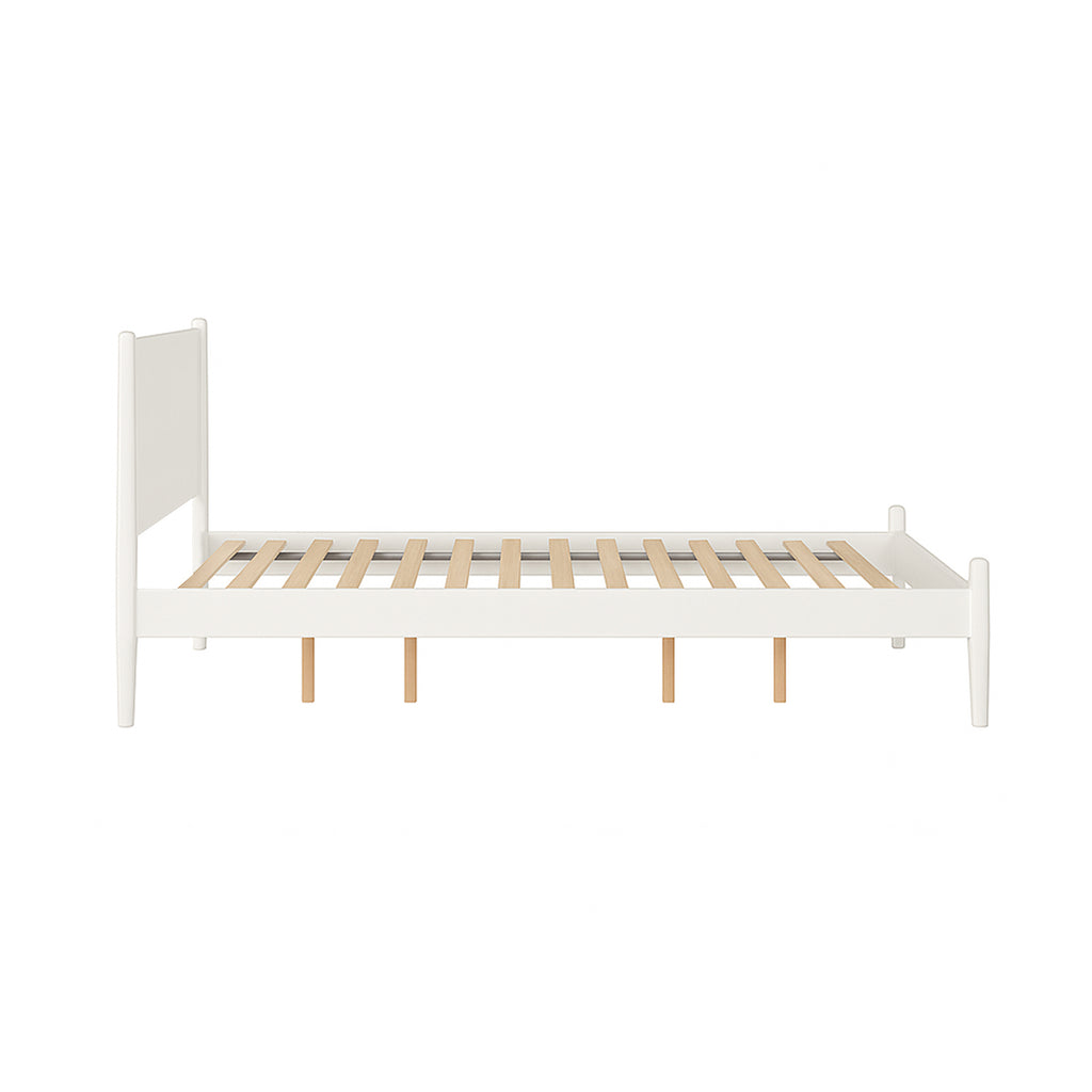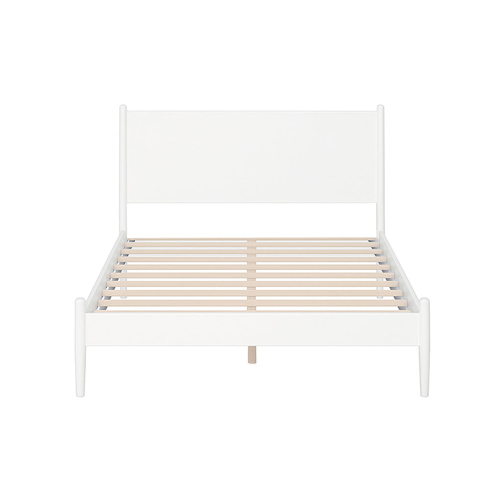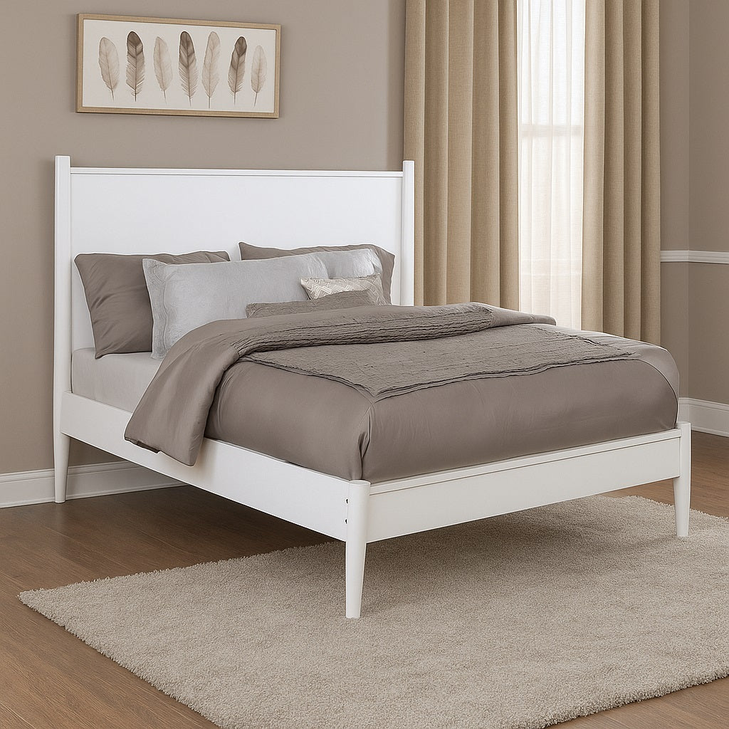 Add a touch of timeless elegance to your bedroom with this Mid-Century platform bed, featuring a white finish and clean, tapered lines that complement both modern and classic interiors. Crafted from durable solid wood and engineered wood, it offers exceptional strength and longevity, while the tall headboard provides comfortable back support for reading or relaxing. The slatted base eliminates the need for a box spring, promoting better airflow and mattress support. Easy to assemble and designed for both style and practicality, this platform bed is the perfect centerpiece for any bedroom retreat.
