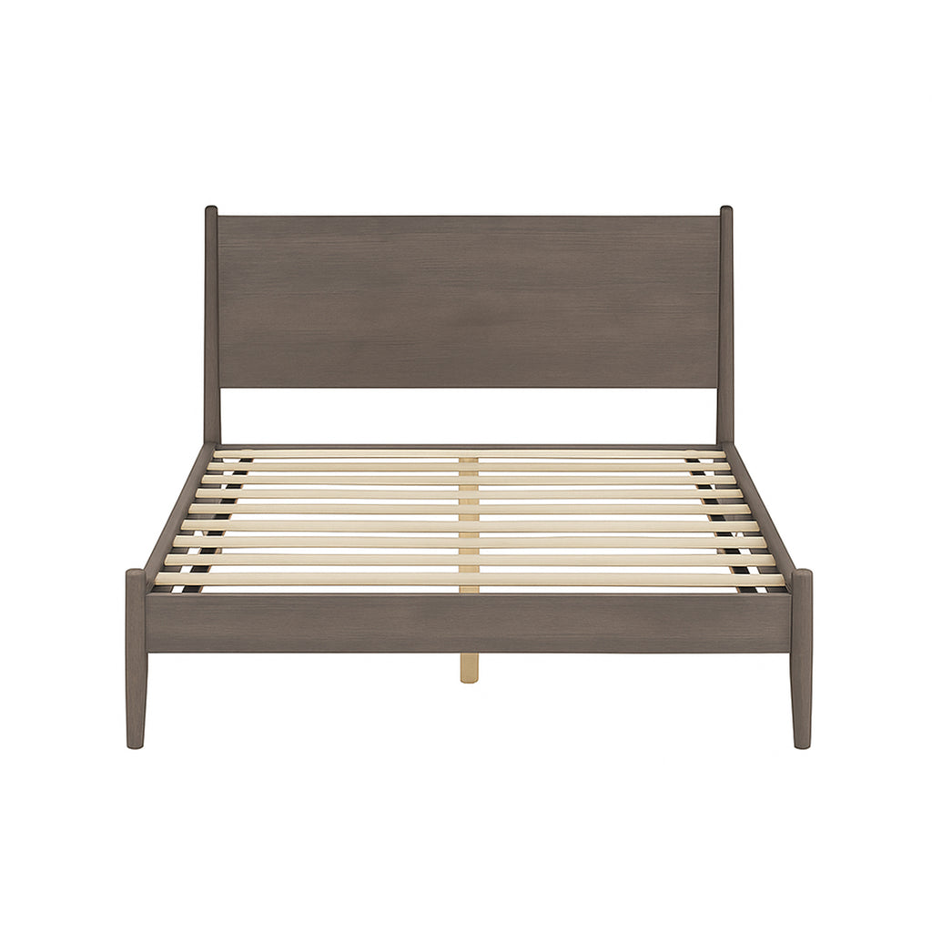 Upgrade your bedroom with the striking simplicity of this Mid-Century modern platform bed, crafted from solid wood and finished in a neutral gray for a refined look. Designed with a spacious Queen Size frame, it features clean lines, slightly tapered legs, and a tall, smooth headboard that adds height and elegance to your space. The supportive slatted platform eliminates the need for a box spring while improving airflow and mattress life, making this bed both functional and effortlessly stylish for modern living.