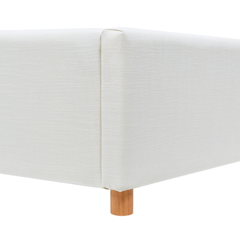- Solid wood rounded feet in a natural finish sits low to the ground for modern appeal