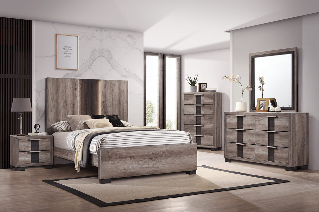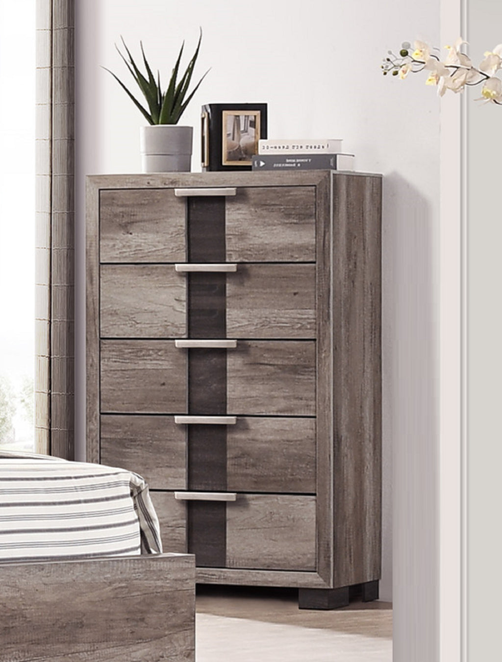This 5-drawer bedroom chest is a stylish and functional addition to any bedroom decor. It features a sleek and modern brown finish, complemented by elegant metal drawer pulls that add a touch of sophistication. With five spacious drawers, there's plenty of room for all your clothing and accessories. The sturdy construction and high-quality materials ensure that this chest is built to last. It's perfect for adding extra storage space to your bedroom and its clean and simple design will blend seamlessly with a wide range of decor styles. Whether you're looking for a standalone piece or to complete a full bedroom set, this 5-drawer bedroom chest is a practical and stylish choice.