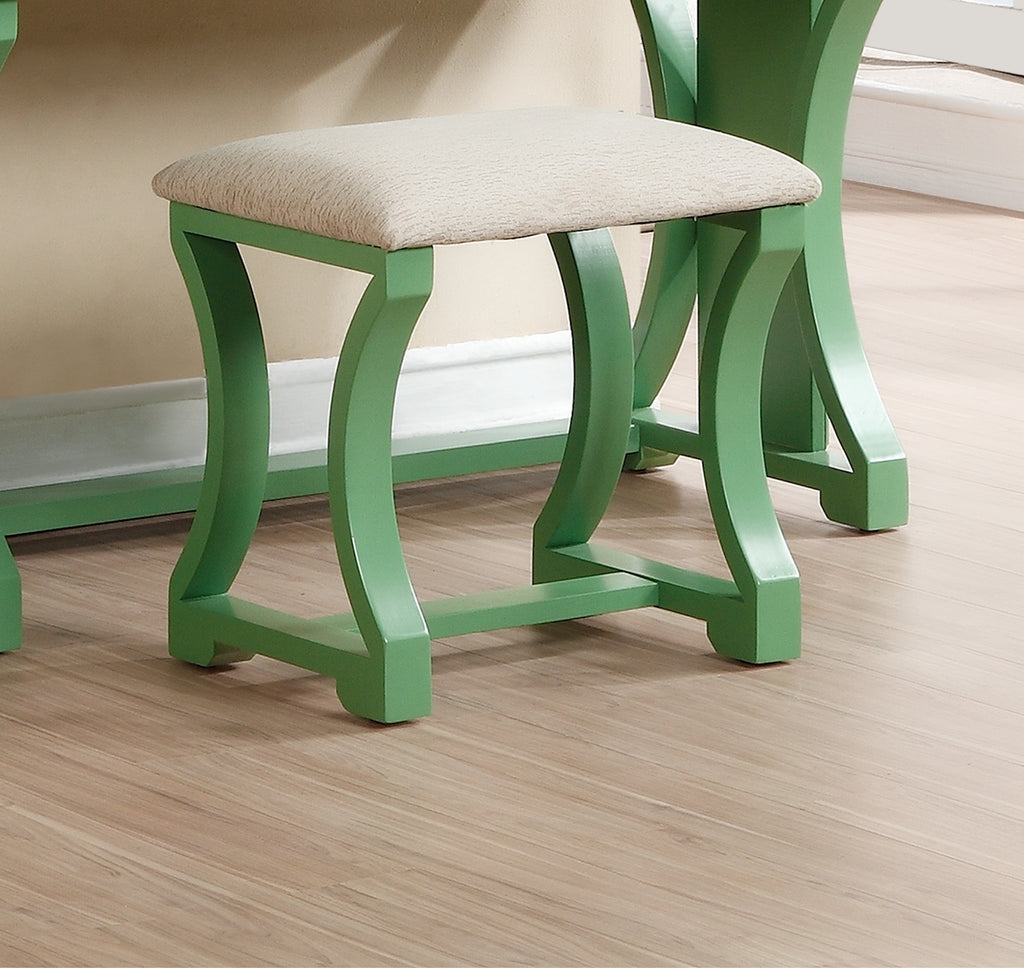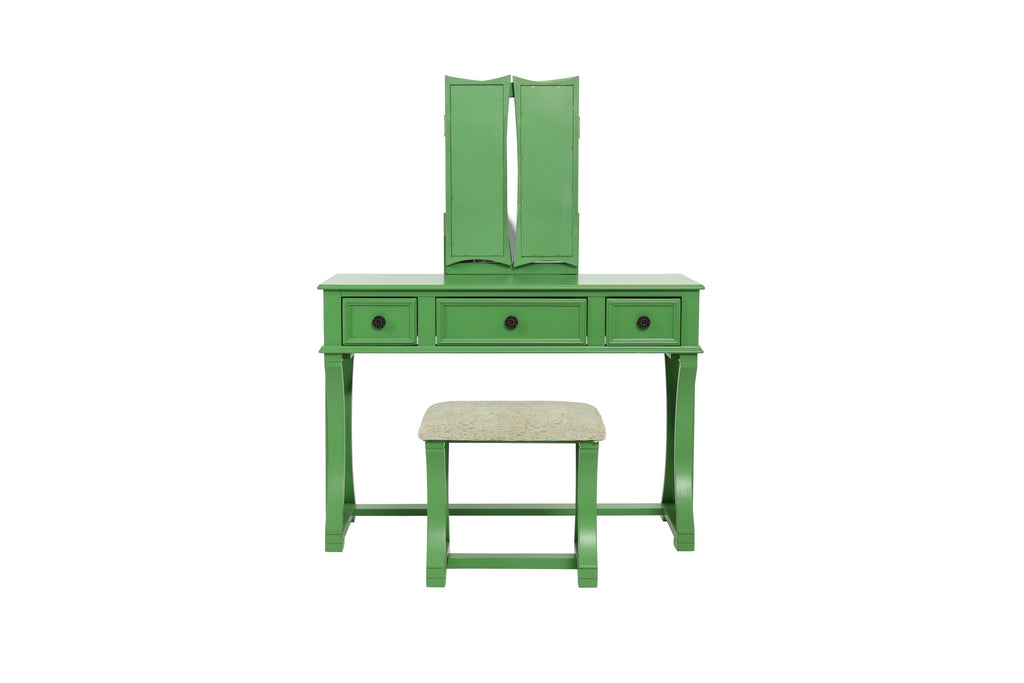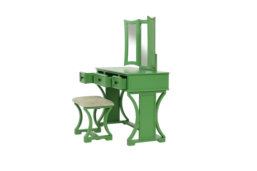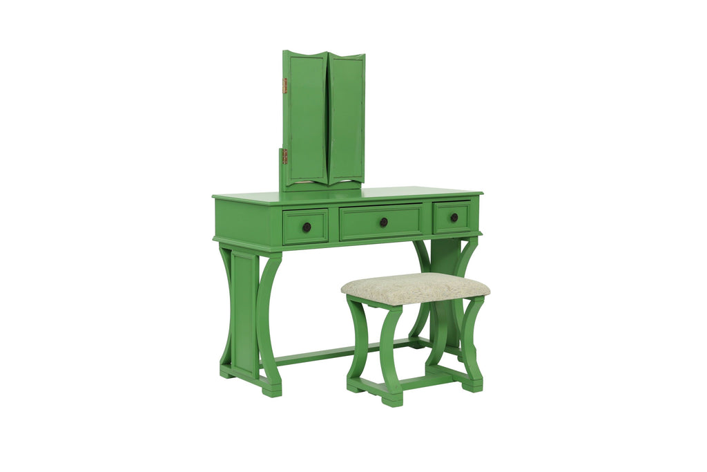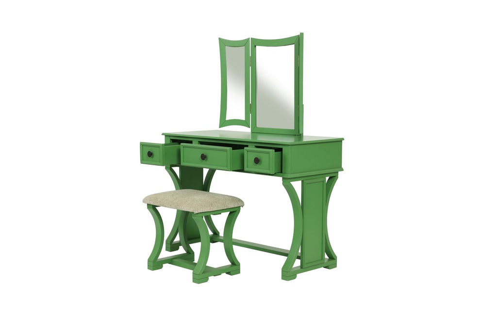 This beautifully designed vanity set features pine wood frame of rustic style. It includes a 3-panel mirror, table with functional drawers, and a cushioned stool. Each pieces is framed in feminine curves and lines making it the perfect addition to your bedroom. Available in black, apple green, cherry, and white.