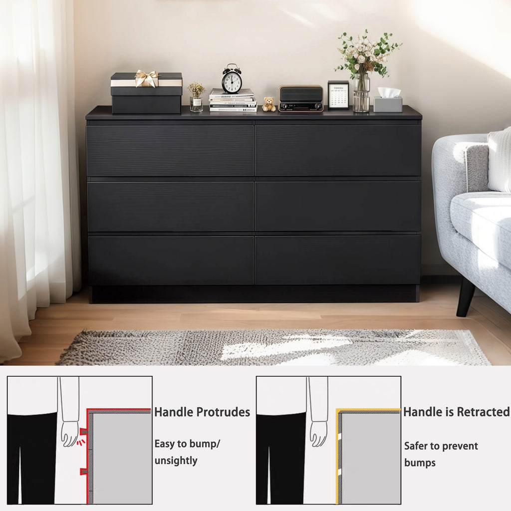 - {Large Storage Space} This 6 drawer black dresser is equipped with 6 large storage drawers. Whether it is seasonal clothing, children's toys, collections of books, or all kinds of personal belongings, they can be easily stored, making the home neat and tidy in an instant. The wide top table is an ideal place to display photo frames, vases, and art ornaments. It can also be flexibly transformed into a TV cabinet to meet diverse needs.