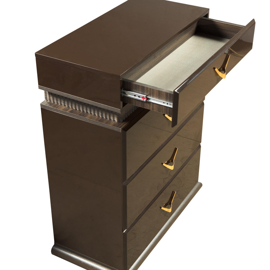 Introducing our Dunhill chest, a blend of functionality and contemporary elegance, now enhanced with integrated LED lights. With its sleek design and modern accents, it's the perfect addition to any bedroom. Featuring five drawers with distinctive V-shape handles, this chest provides ample storage space while adding a touch of flair to your decor.