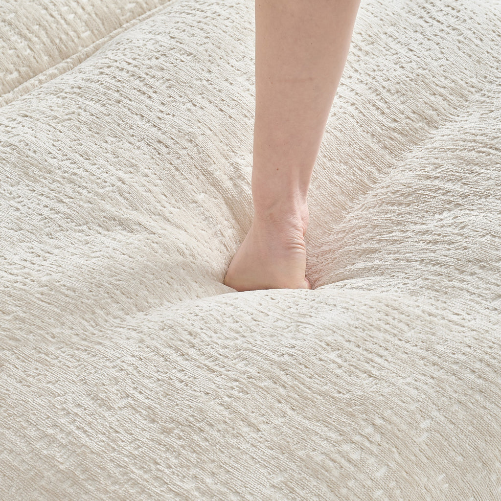 - Plush Chenille fabric meets engineered comfort. Dual-layer seat: soft HR foam atop high-density foam & springs. Solid wood frame supports 500lbs. 3 back cushions + lumbar pillow. Ottoman adds versatility.