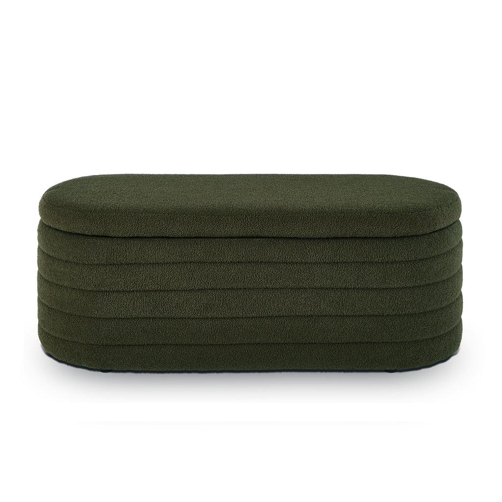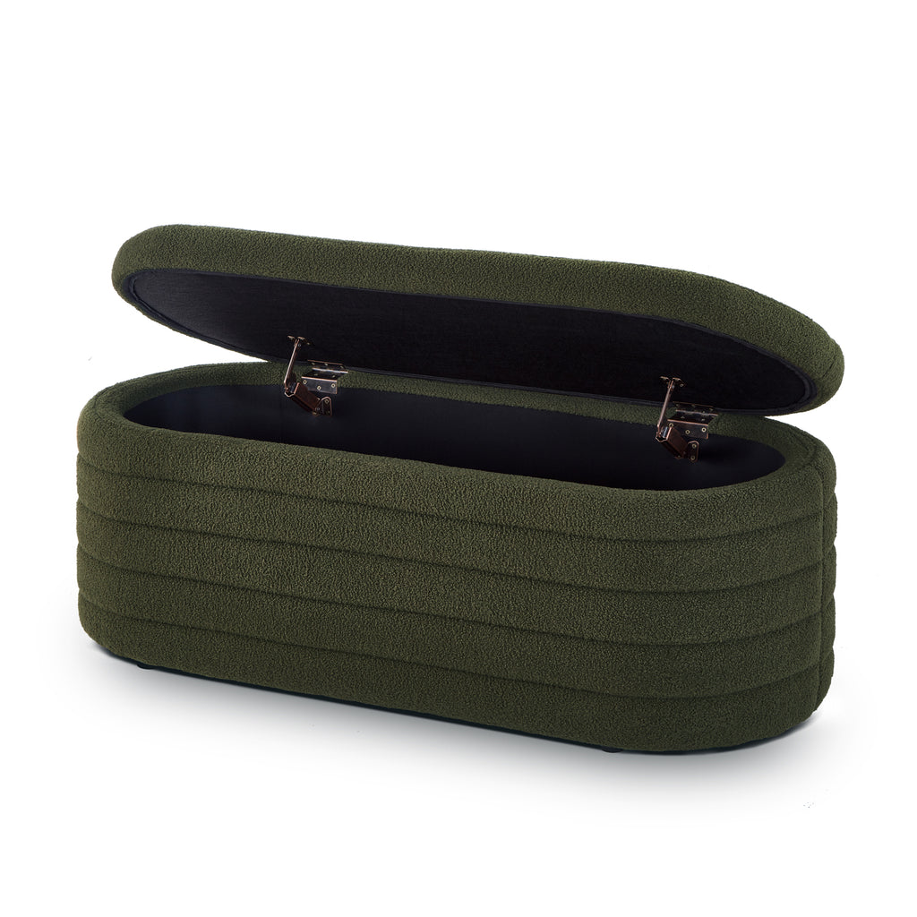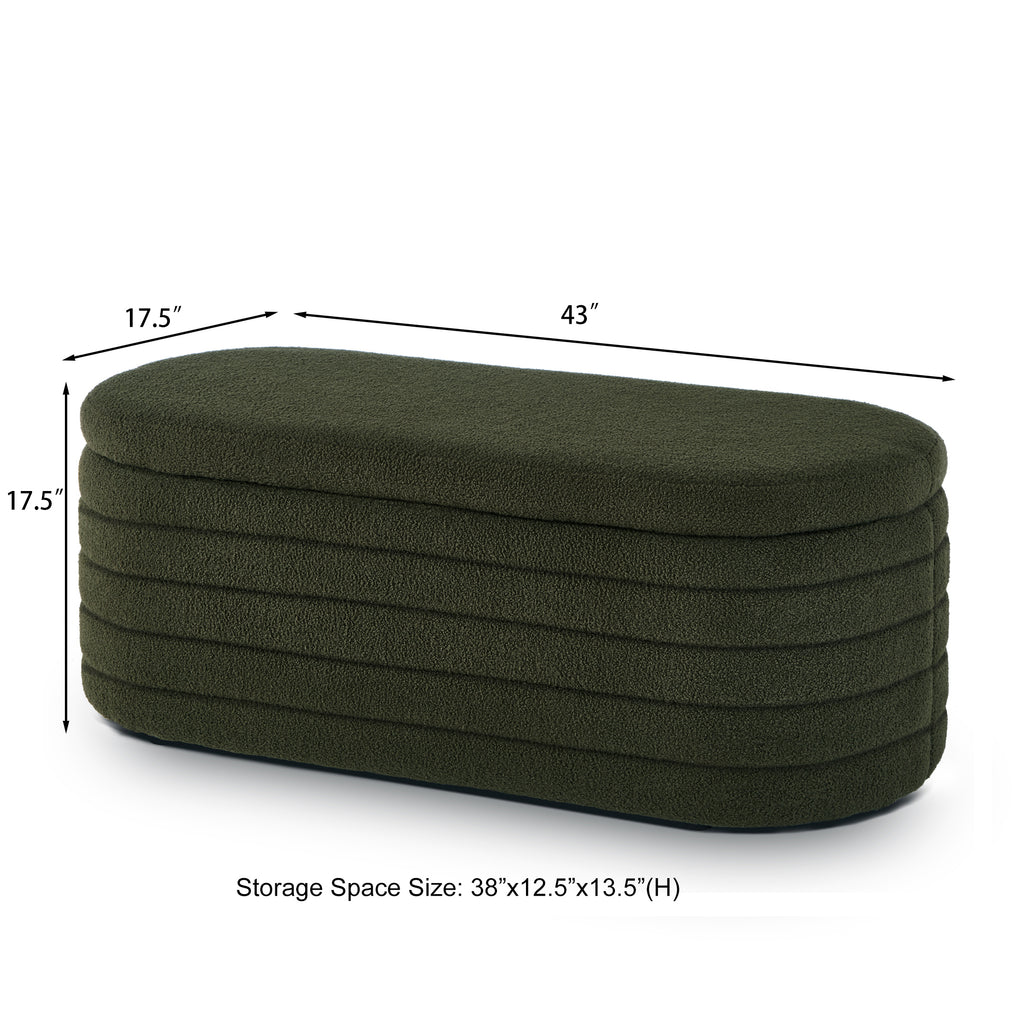 This oval storage bench exudes elegance and practicality, featuring a teddy fabric that provides a soft and comfortable seating experience. The luxurious material not only adds a touch of refinement but also ensures a cozy and inviting feel for users.