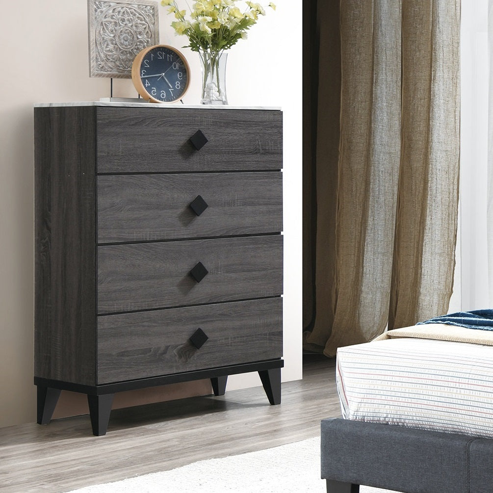 Modern design is given subtle glamorous accent in the design of the beautiful Collection. Black square hardware boldly fronts each drawer of the chest with black base framing lending additional accent to the cream faux marble-look of the collection.