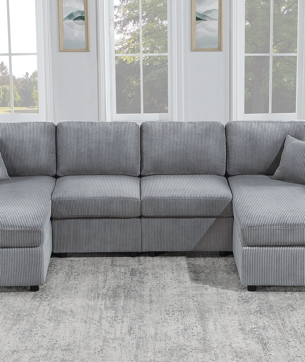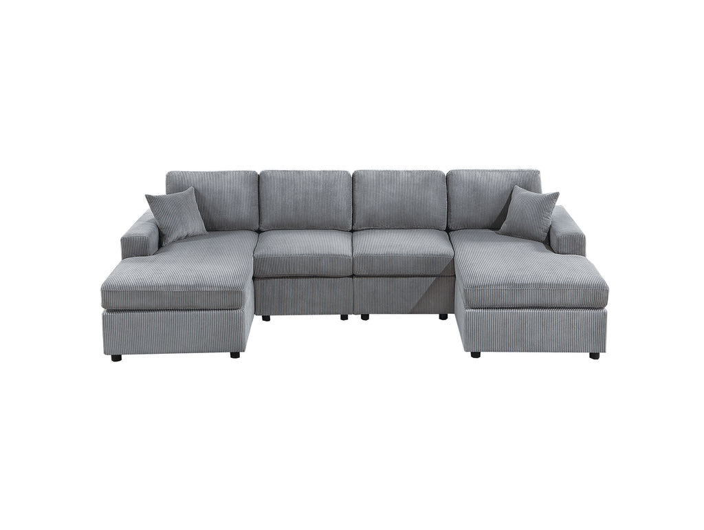 This stunning piece is designed for ultimate relaxation, featuring two chaise lounges on either end, perfect for sprawling out after a long day or sharing movie nights with loved ones. The crisp lines of the square arms add a touch of modern elegance to the overall design. The plush corduroy fabric exudes warmth and texture, creating a sophisticated and inviting atmosphere in your living room. Two decorative throw pillows are included, adding a touch of personality and extra comfort to your sectional.