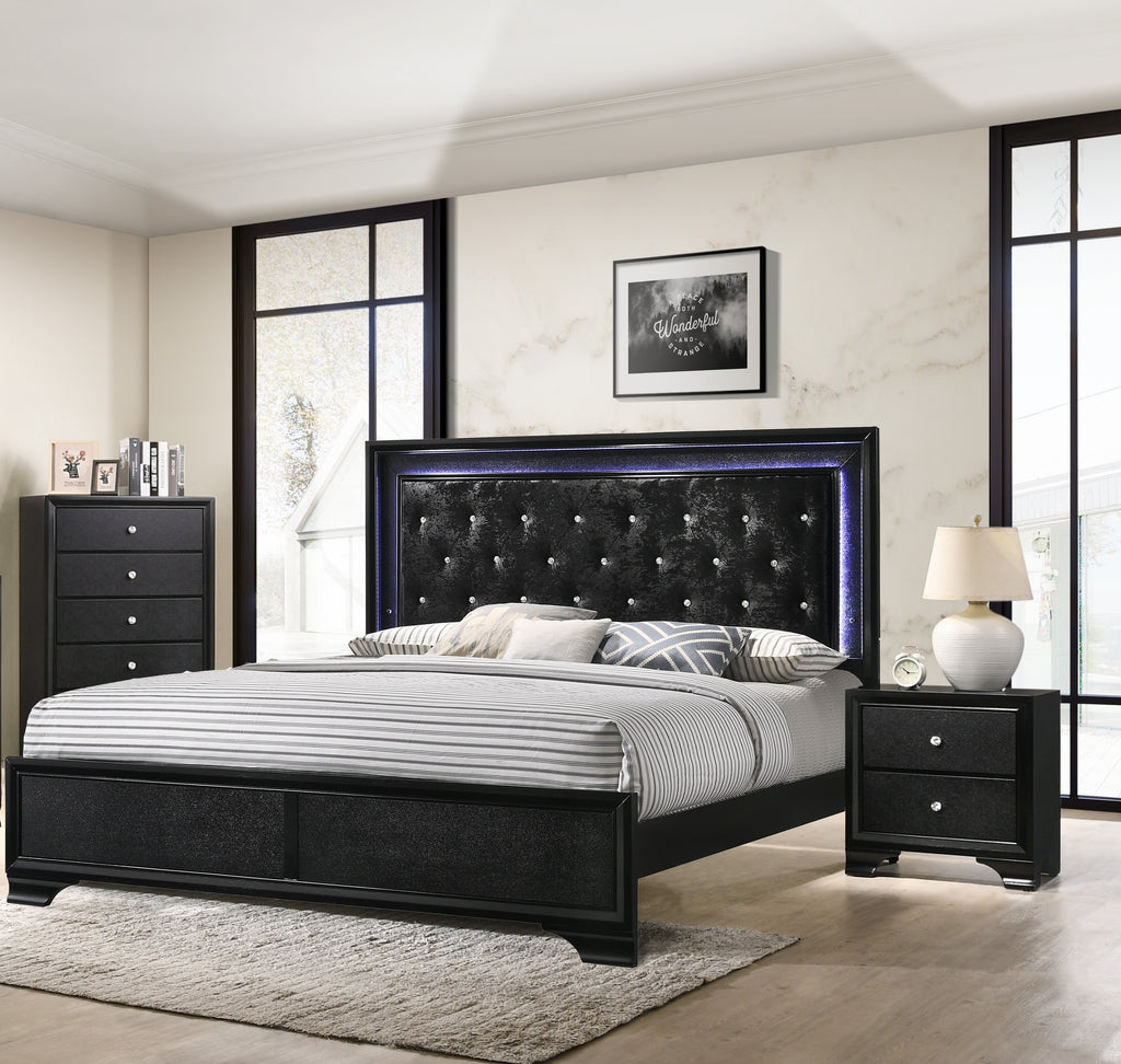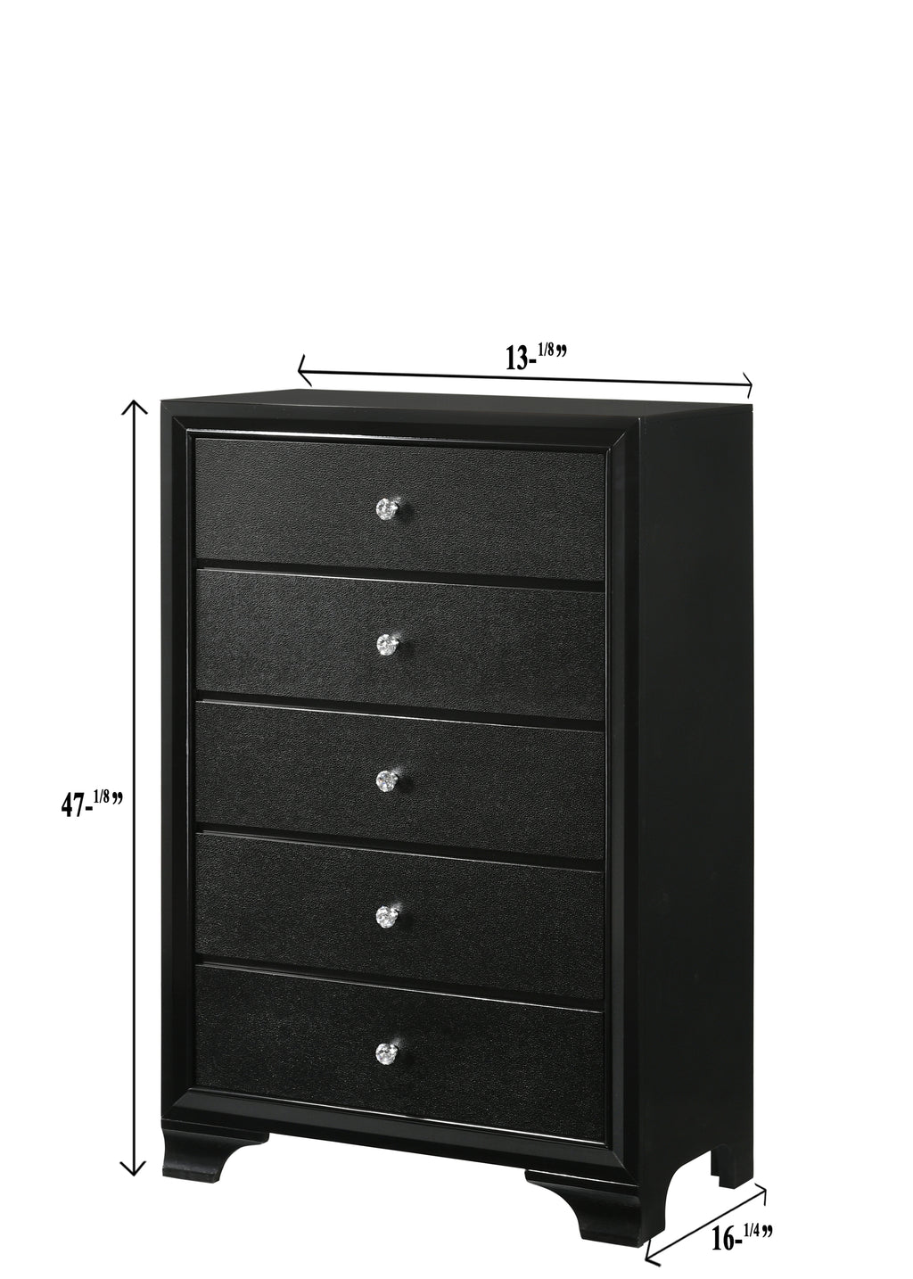 Add touches of bold and glamorous style to your bedroom with this 5-drawer chest. Its textured drawer fronts and sparkly hardware create its fashionable look, while its dark finish makes a striking statement. Coordinating this storage solution with the other items in the bedroom set will offer ample space. With the gracefully designed drawers and shimmering hardware, this chest is sure to create a chic aesthetic in your bedroom.br>