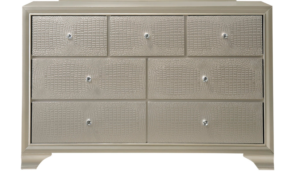 This charming dresser features an embossed champagne crocodile finish and decorative knob hardware. Not just nice to look at, the dresser has seven drawers sturdily constructed with French and English dovetail joinery. The top three drawers are lined with felt to help protect delicate items. Pair with the matching mirror for a glamorous and stylish set.