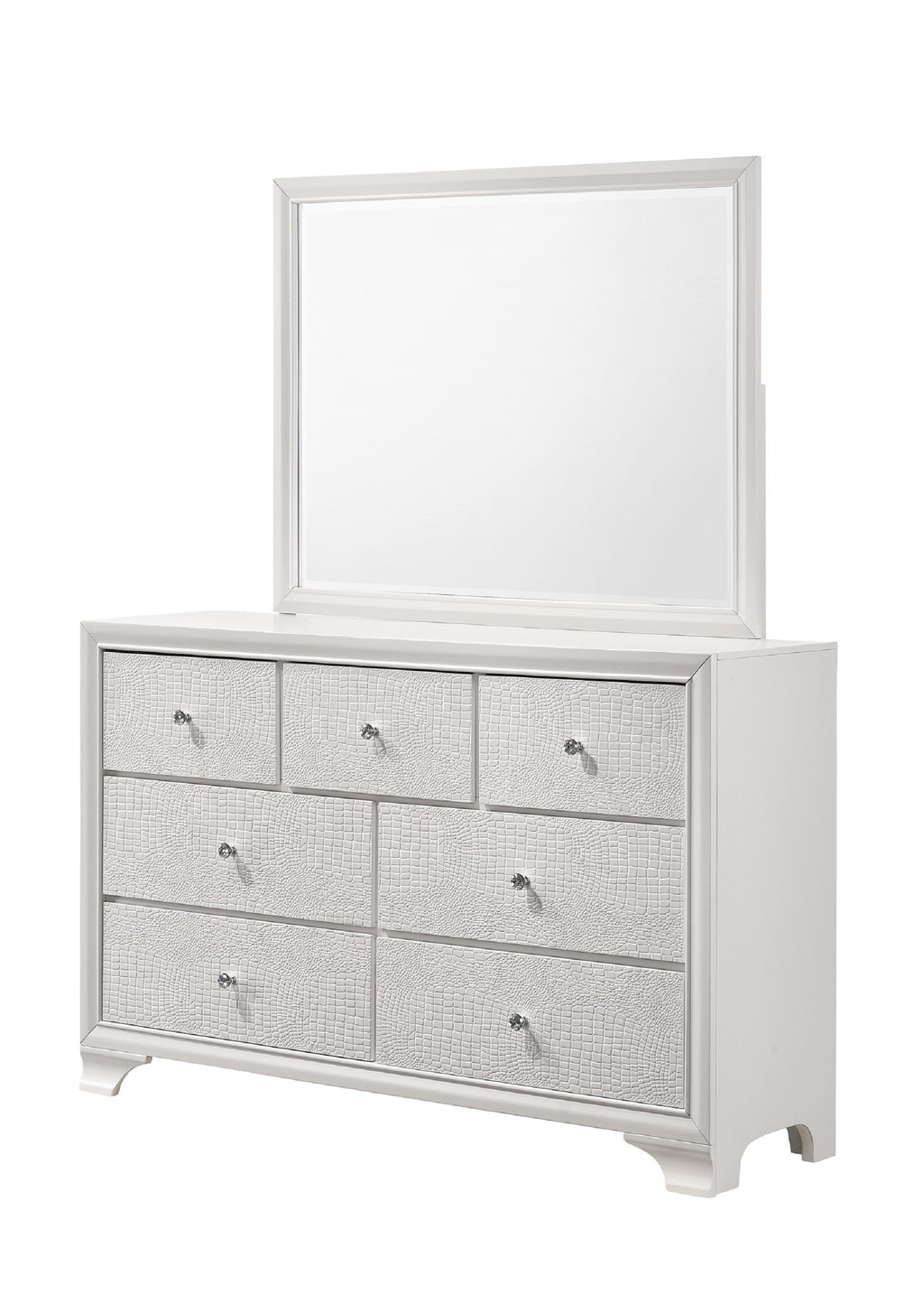 This charming dresser features an embossed champagne crocodile finish and decorative knob hardware. Not just nice to look at, the dresser has seven drawers sturdily constructed with French and English dovetail joinery. The top three drawers are lined with felt to help protect delicate items. Pair with the matching mirror for a glamorous and stylish set.