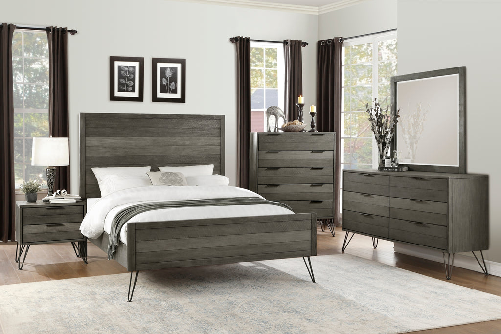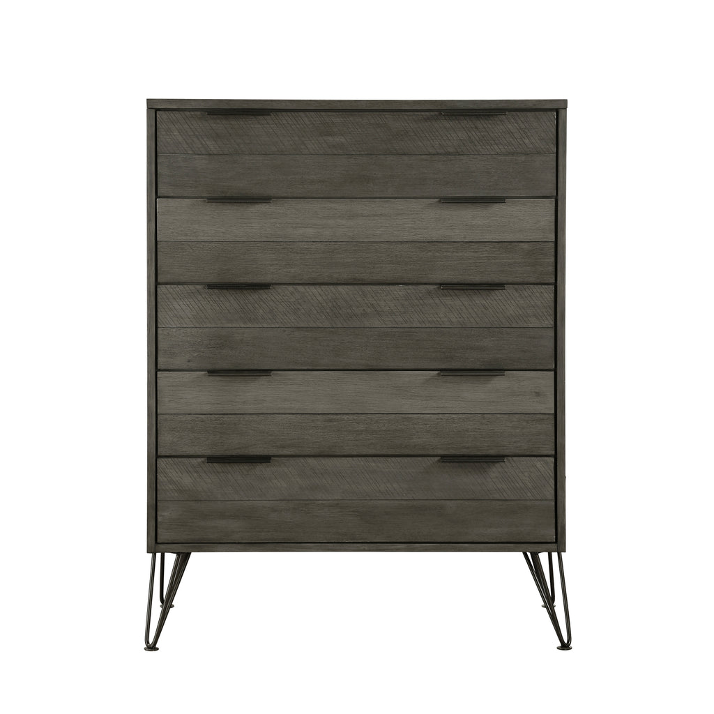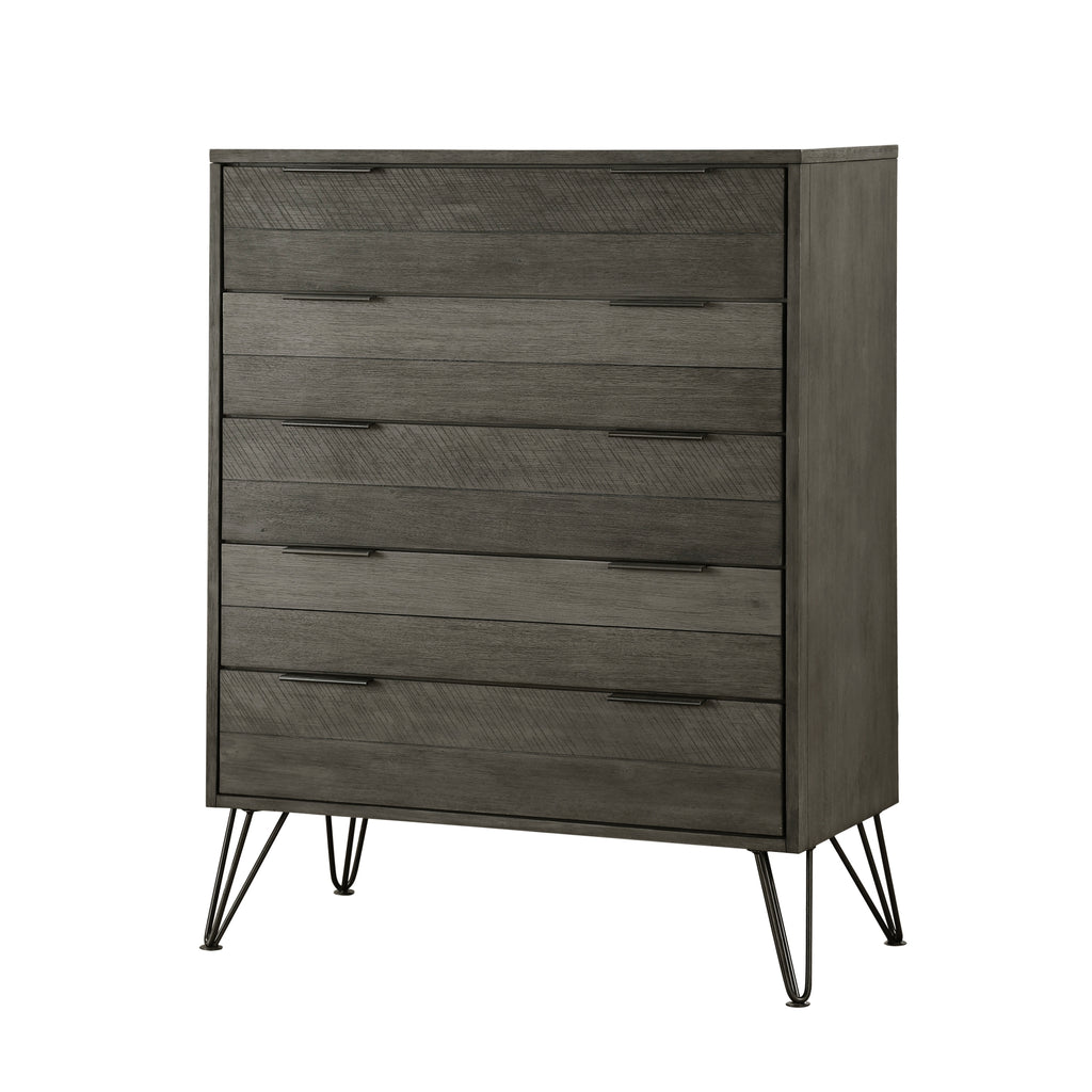 The chests solid acacia wood with acacia veneer is highlighted by a 3-tone grey finish that allows the variance of the natural grain to shine. The horizontal slat design, five-drawer configuration and metal pull tab hardware lend to the clean, contemporary look.