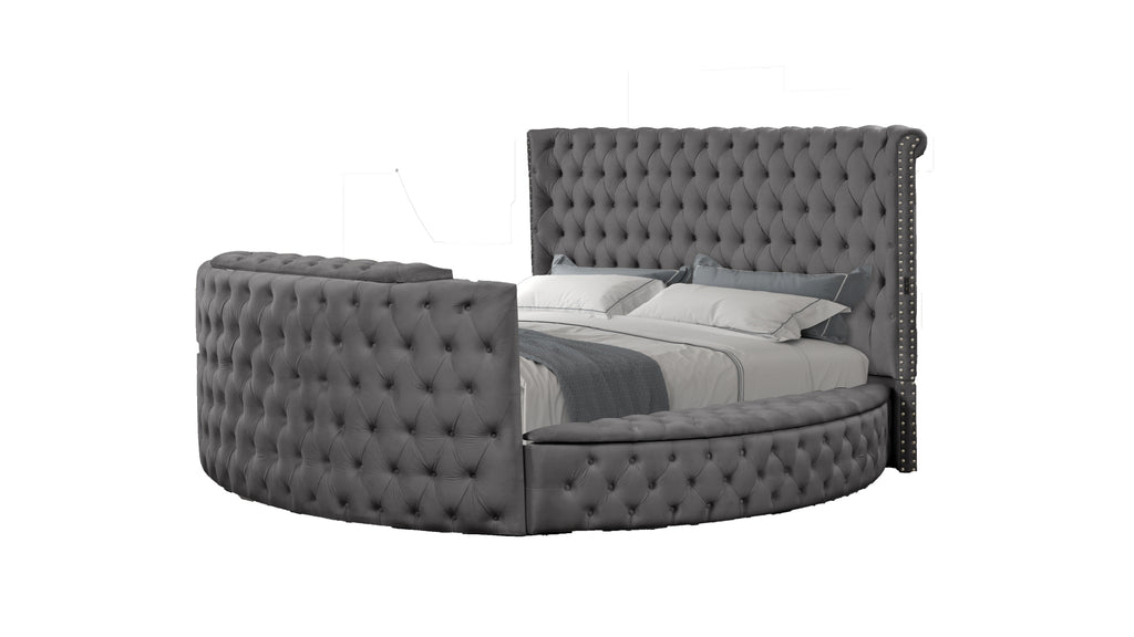 Indulge in the luxury and modern functionality with this elegant bed, thoughtfully crafted from a combination of solid and engineered wood for unmatched durability. Available in both queen and king sizes to suit your preferences, its tufted upholstered velvet fabric headboard and footboard exude both opulence and comfort. Stay organized effortlessly with ample storage on both sides, while the built in USB chargers ensure your devices are always ready. The innovative footboard design doubles as a TV stand, offering ultimate convenience and entertainment possibilities (TV not included)