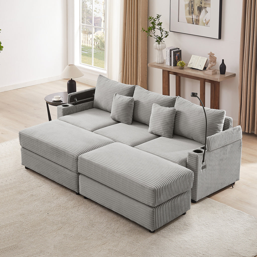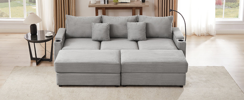 This modular sofa set features multiple seating options and ottomans, allowing you to purchase additional modules to create a variety of configurations. The movable ottoman adds flexibility, enabling you to find the perfect spot for sitting or lounging. Crafted with a solid frame and wrapped in textured corduroy upholstery, this set combines durability with style. Ideal for your living room, home office, or reception area, it effortlessly reflects your personal taste while creating a cozy atmosphere.