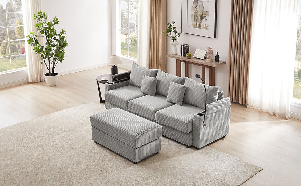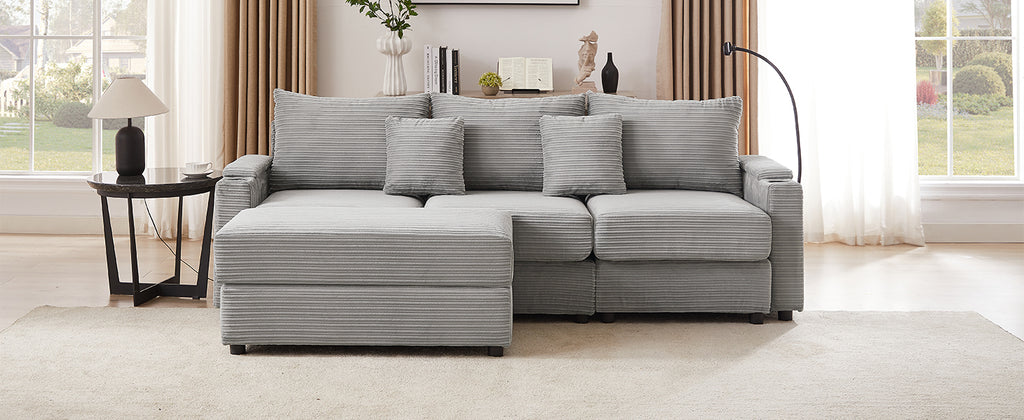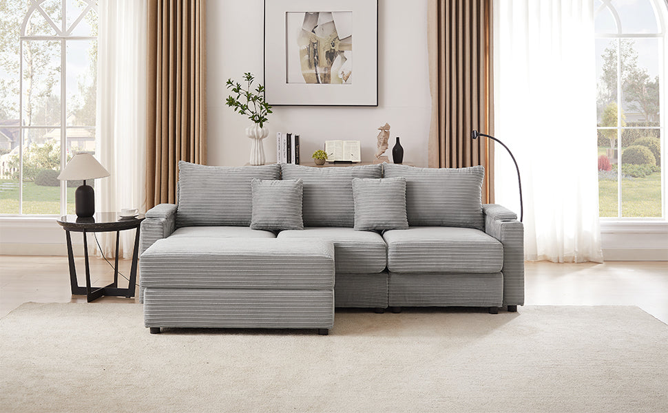 This modular sofa set features multiple seating options and ottomans, allowing you to purchase additional modules to create a variety of configurations. The movable ottoman adds flexibility, enabling you to find the perfect spot for sitting or lounging. Crafted with a solid frame and wrapped in textured corduroy upholstery, this set combines durability with style. Ideal for your living room, home office, or reception area, it effortlessly reflects your personal taste while creating a cozy atmosphere.