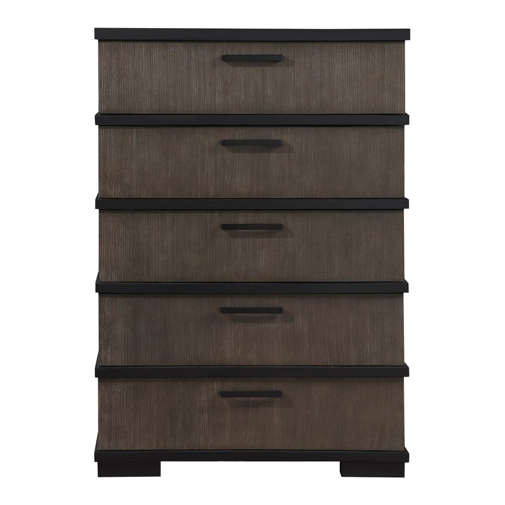 Modern lines pair with texture and hue to create the dynamic look of the Acworth Collection. The two-tone brown-ish gray and black finish over oak veneer of the collection lends to the modern-industrial inspired aesthetic that comprises the collection’s design. Black bar hardware fronts the drawers of the drawers of the chest, their minimalistic lines providing bold accent to the piece. PRODUCT DIMENSIONS: Overall Dimension: 40' x 18' x 56'H Drawer interior: 34.5'x14'x6.5' (5) Listing Includes: One Chest Only. Simple Assembly Require.