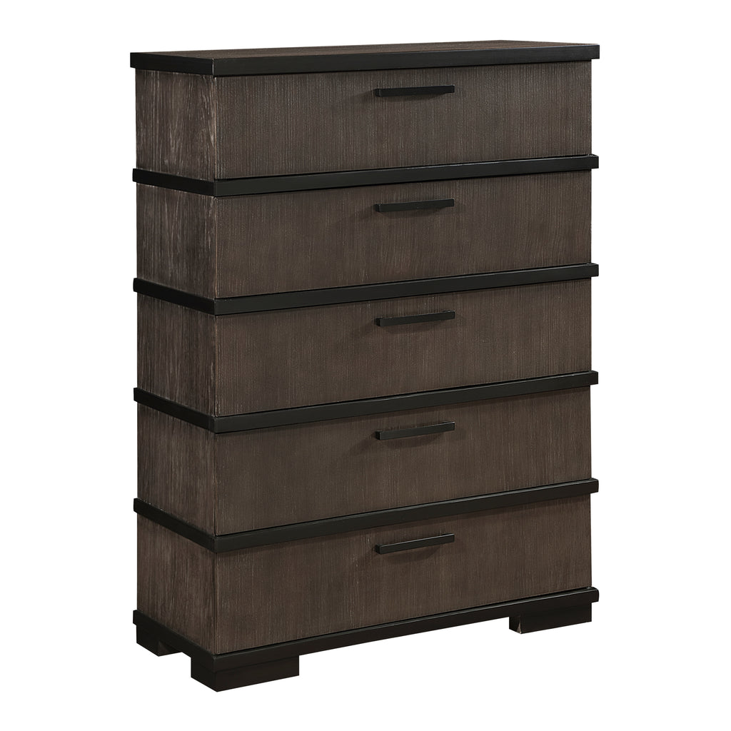 Modern lines pair with texture and hue to create the dynamic look of the Acworth Collection. The two-tone brown-ish gray and black finish over oak veneer of the collection lends to the modern-industrial inspired aesthetic that comprises the collection’s design. Black bar hardware fronts the drawers of the drawers of the chest, their minimalistic lines providing bold accent to the piece.