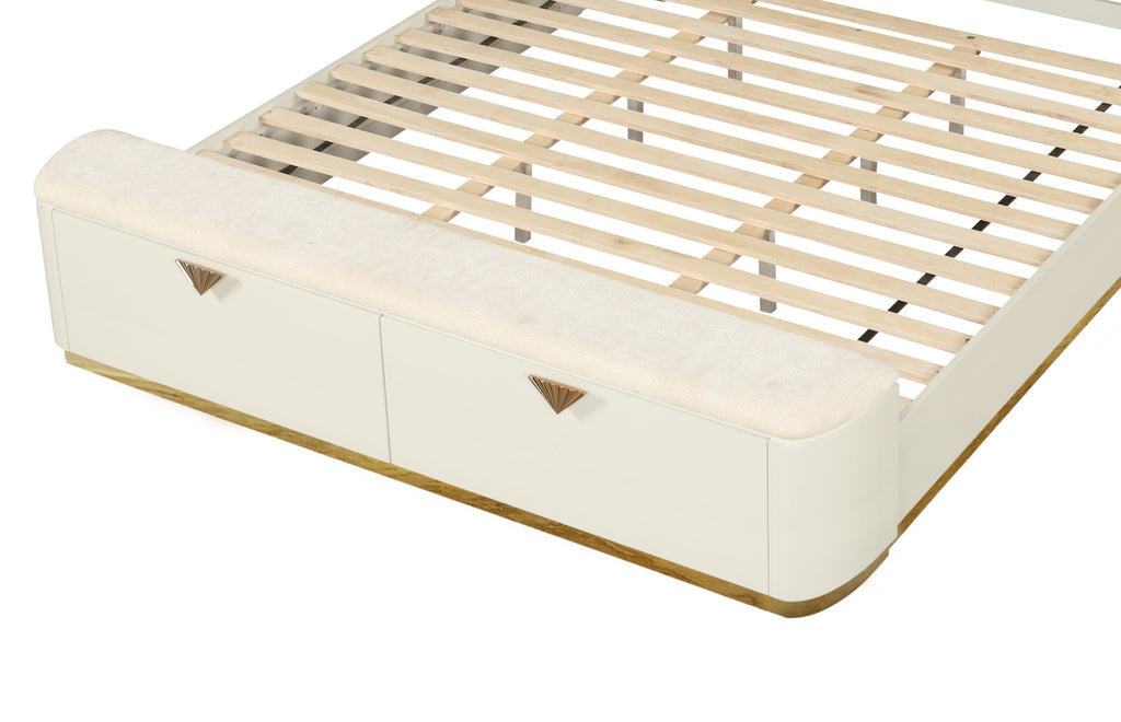 The bed with its upholstered headboard includes ambient lighting and built-in drawers for added convenience.