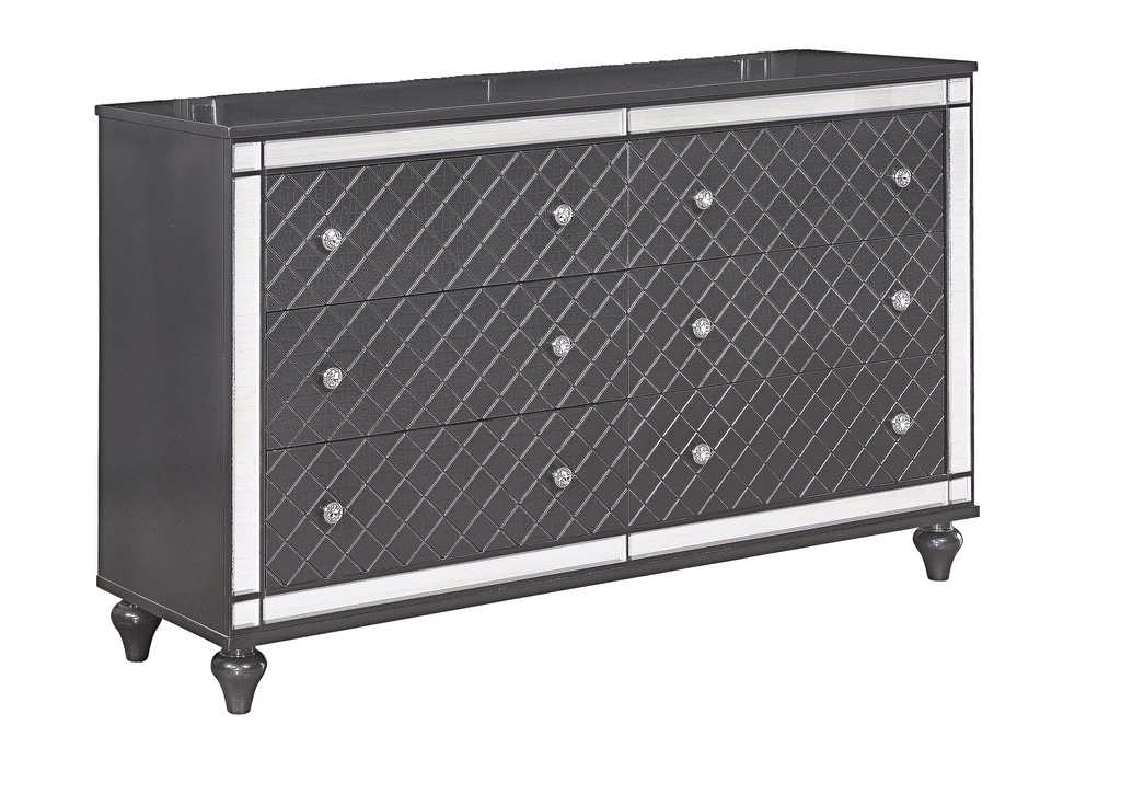 Description:- Spice up your bedroom with this glamorous dresser. Indulge in the elegant style of the shining mirror plating contrasting with the dark finish. The thin line pattern and faux crystal drawer knobs add extra depth and intrigue to the piece. Use the six drawers to store your personal items away so that clutter doesn't distract from this sparkling dresser.