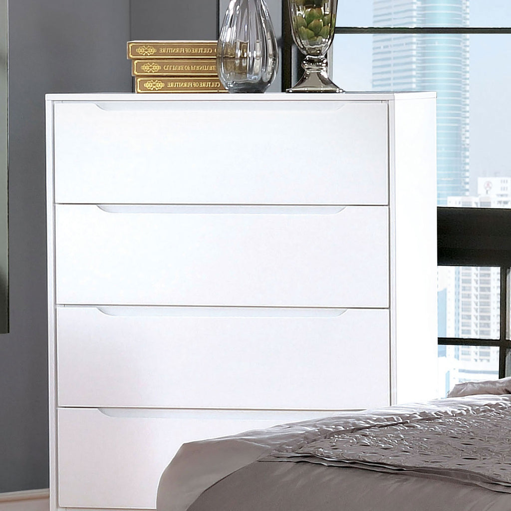 For a quick modern update to your home, this collection will add that trendy mid-century appeal. Featuring a White finish, this chest boast slim flared legs and recessed handle drawer pulls.