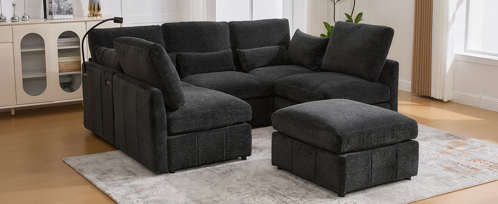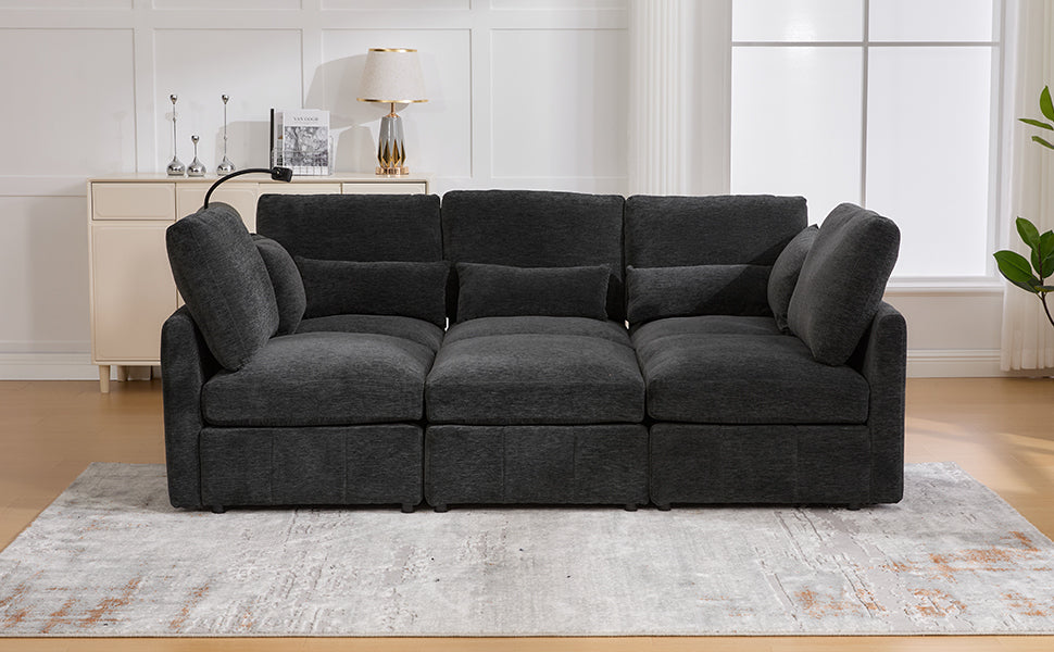 This multi-functional modular sectional sofa offers exceptional versatility with its reconfigurable design, allowing you to switch between a U-shaped, L-shaped, or sofa bed layout with ease—perfect for flexible seating or accommodating overnight guests. Upholstered in soft and durable chenille fabric, it combines comfort and elegance, while three ergonomic lumbar pillows provide added support and style. For modern convenience, the sofa also includes two built-in USB charging ports and a phone holder, keeping your devices powered and accessible at all times.