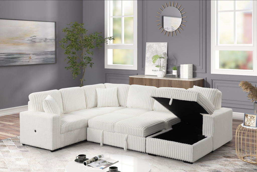 This luxurious sectional sofa combines style and functionality to transform your living room into a space of comfort and elegance. Designed with plush seating and a sleek, modern aesthetic, it offers the ultimate lounging experience during the day and easily converts into a cozy bed for the night with its integrated sleeper function. The chaise is equipped with convenient built-in storage, perfect for keeping your essentials organized and out of sight. With USB ports incorporated into the design, you can stay connected and charge your devices with ease. Available in sophisticated colors like Cream, Gray, and Black, this sectional complements various interior styles and adds a touch of luxury to any space.