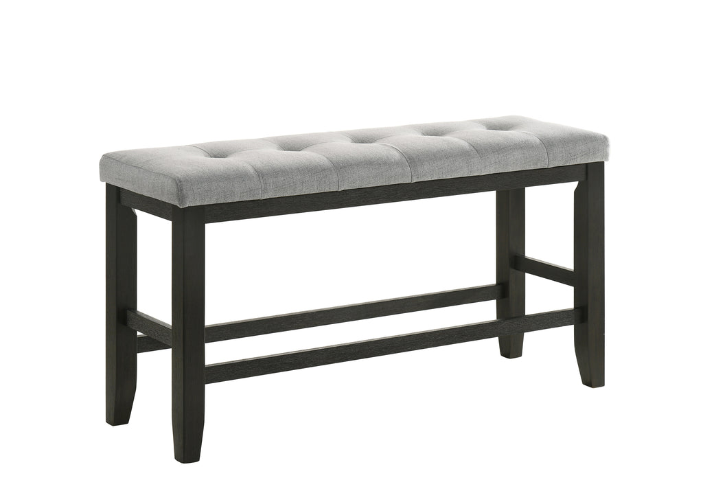 Product Description: This counter height bench adds great seating to complement the rectangular counter height table. The tufted upholstery seat with the gray fabric adds chic sophistication to this contemporary style bench.