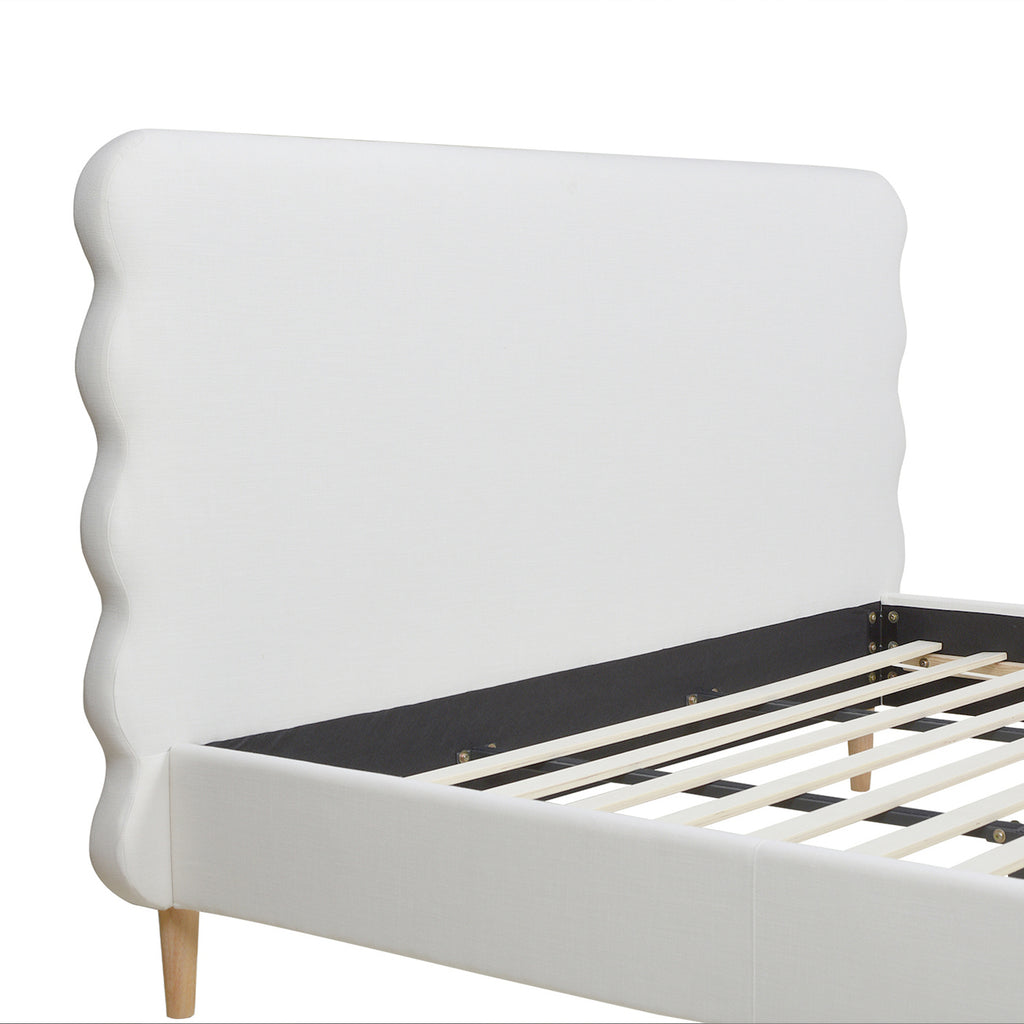 - Fully upholstered bed frame including headboard, side rails, and platform supports