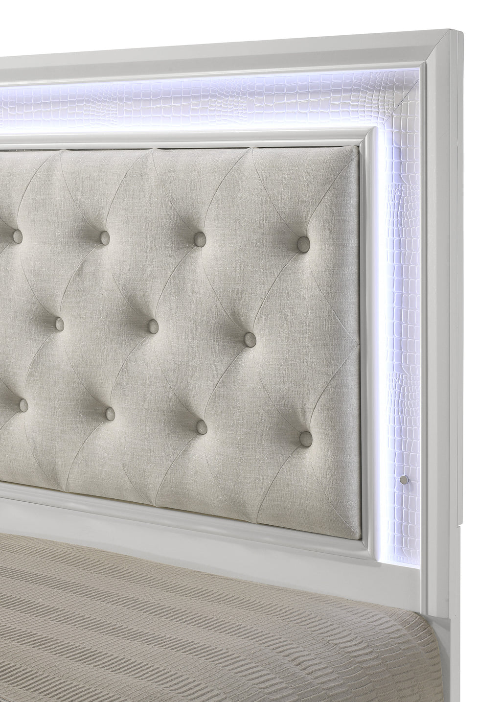 Product Description: Transform your bedroom into a sanctuary of modern luxury with this Oat and Frost LED Upholstered Panel Bed. Adorned in a sophisticated silver champagne finish and crafted with an embossed crocodile pattern, this statement piece instantly uplifts any contemporary or transitional interior. Imagine unwinding in a serene, light-infused bedroom, where the integrated LED backlit headboard gently illuminates your evenings with ambient radiance. The plush, button-tufted headboard—upholstered in soft, silk-look vinyl—invites you to recline in comfort, while the bed's refined lines and exclusive details bring a sense of grandeur and tranquility to every night. Perfect for urban retreats or spacious master suites seeking to combine glamour with practical comfort, this panel bed is the centerpiece of the acclaimed this Bedroom Collection. With its blend of traditional charm and cutting-edge style, it's designed to meet the highest standards of quality, comfort, and modern sensibility.