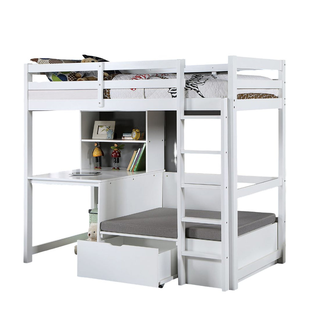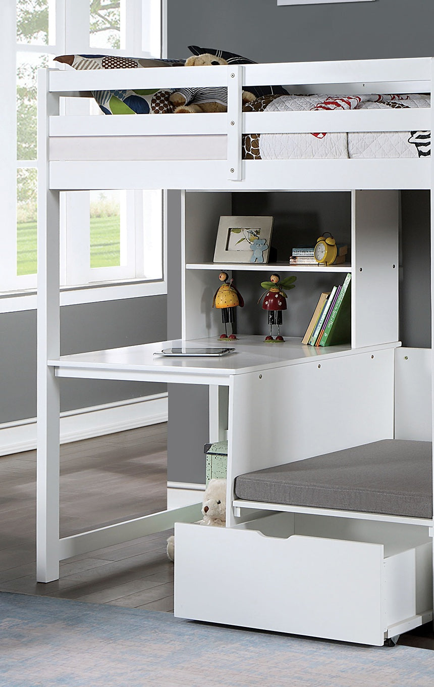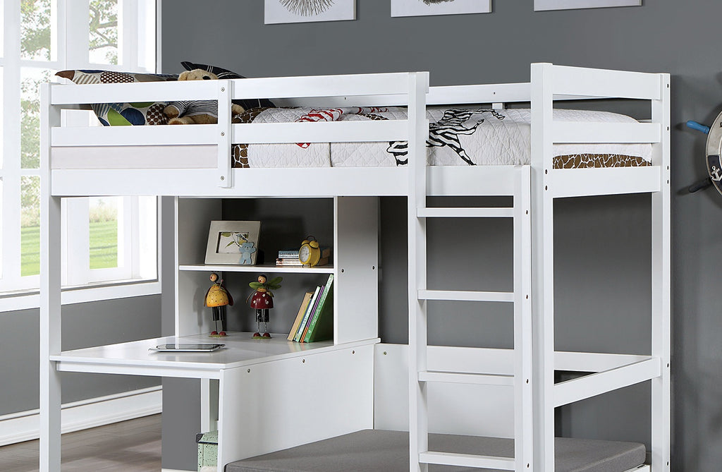 For this piece of youth furniture, getting homework done is not an issue! Your kids will spend a lot of time on the built-in workstation, with bookcase and a desk where they can write and read to their heart's content. Next to the station is a cushioned seat for them to relax on, with plenty of storage underneath for their books and toys alike. Up top is a twin size loft bed; when it's time to go to bed, a quick climb up the attached ladder will get them all settled in.