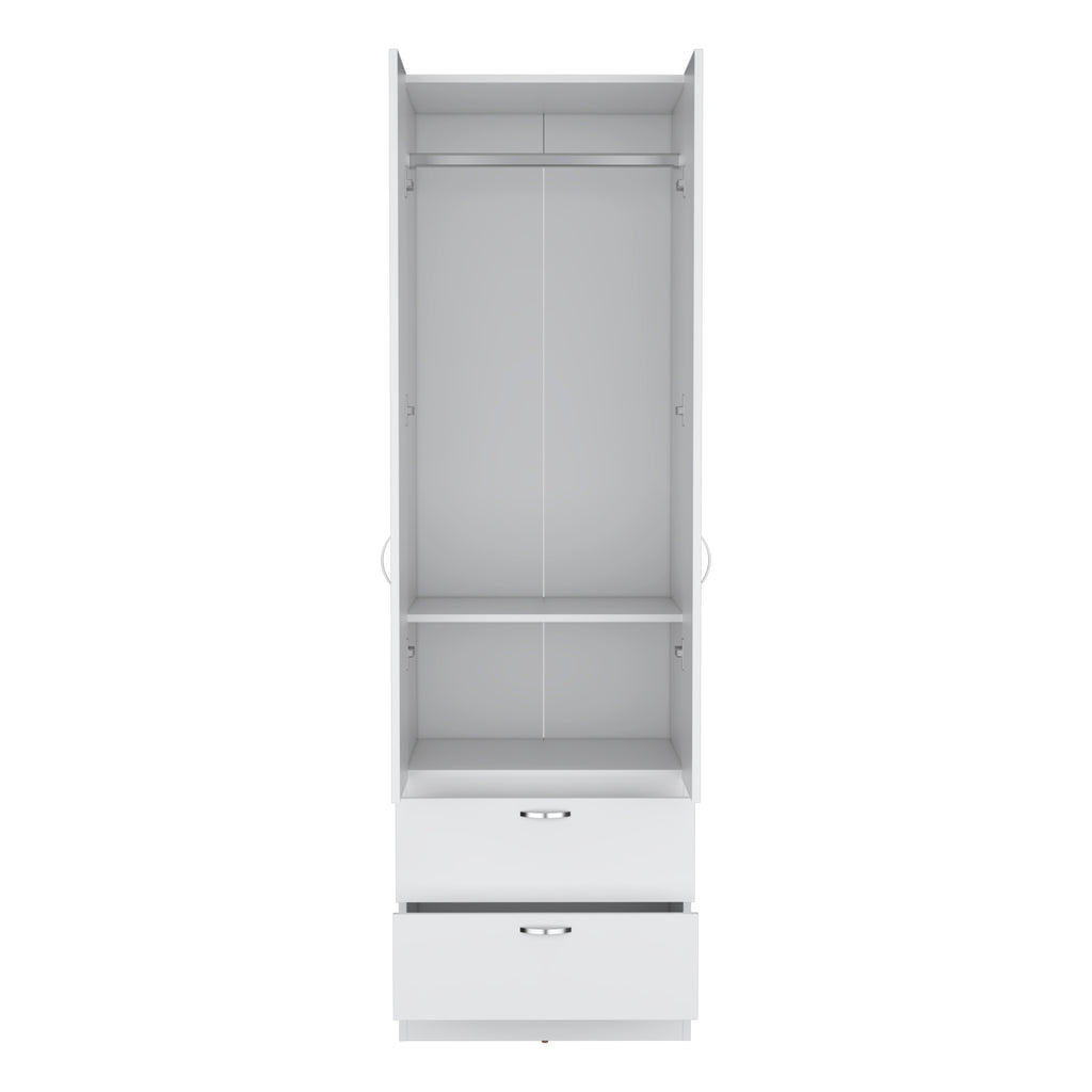 - The wardrobe has a shelf that provides storage for larger items such as sweaters, pants, and dresses.