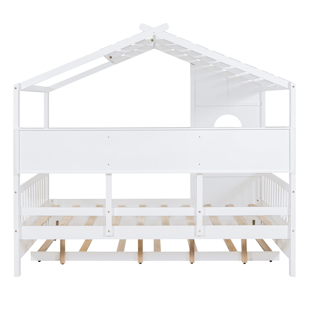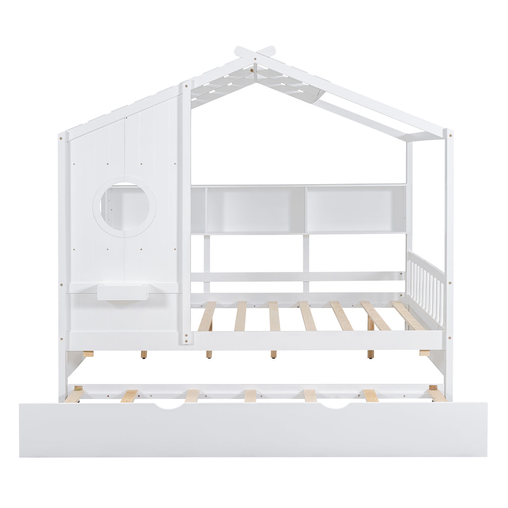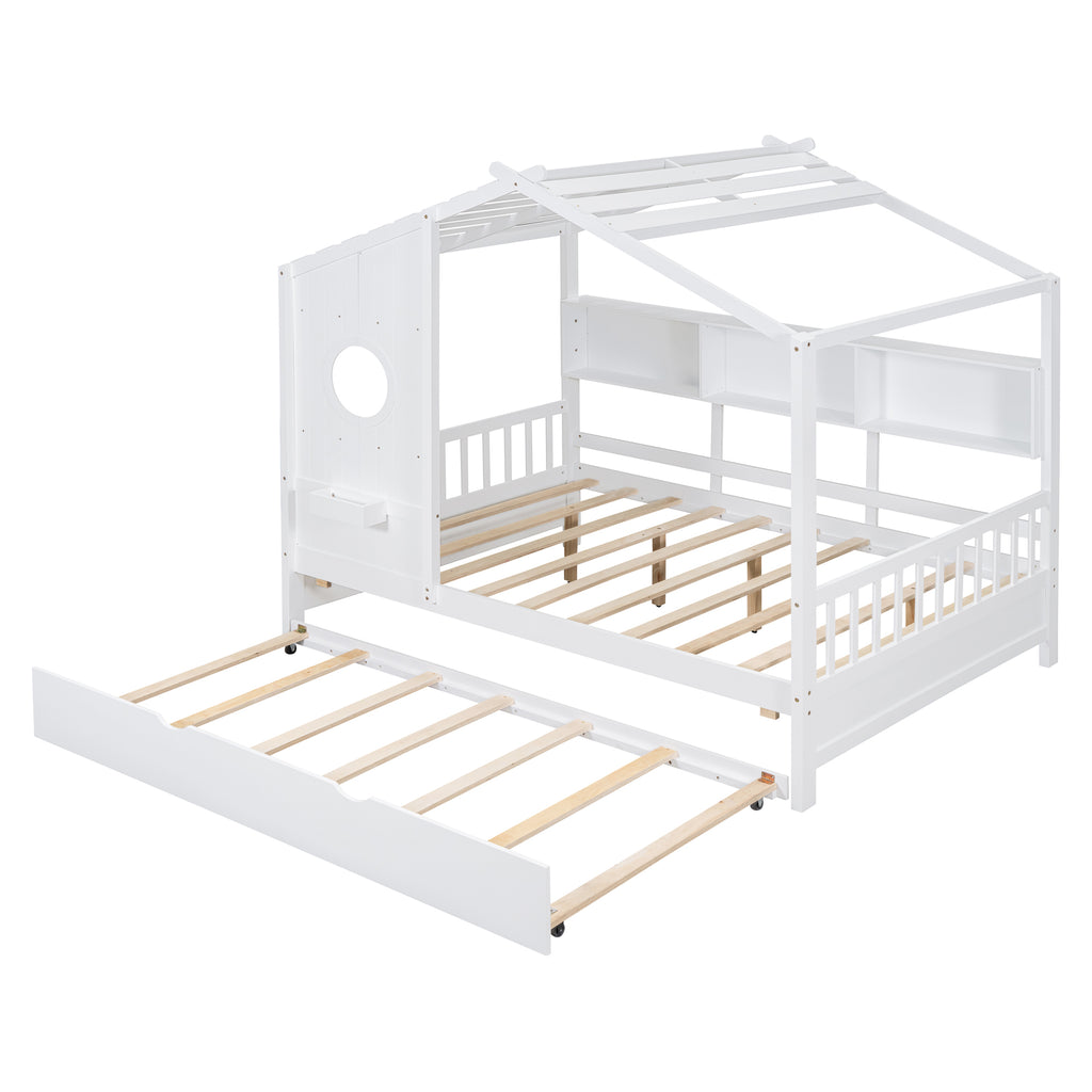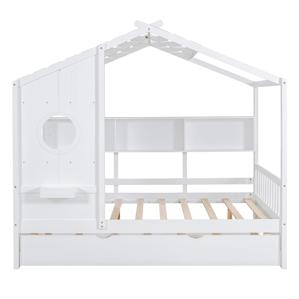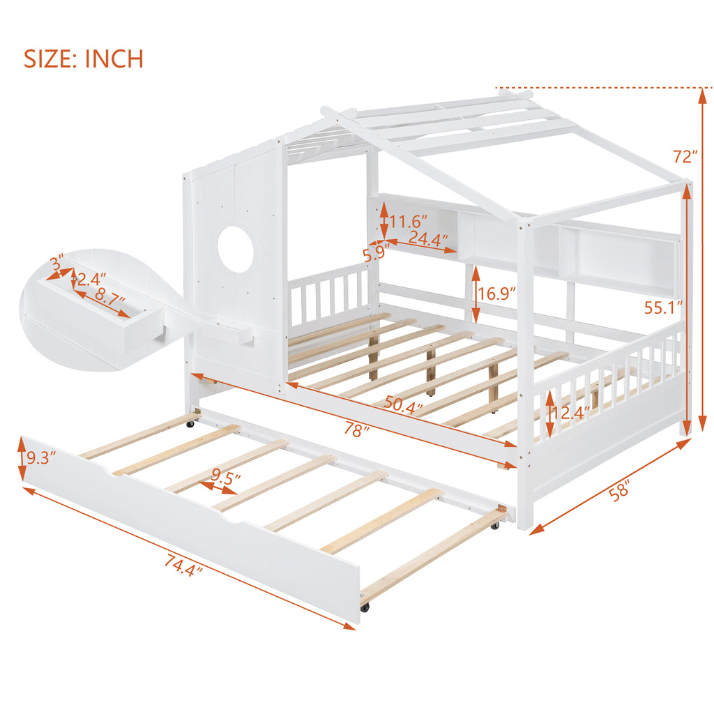 Wooden Full Size House Bed With Trundle, Modern Design for Kids with Storage Shlef, White