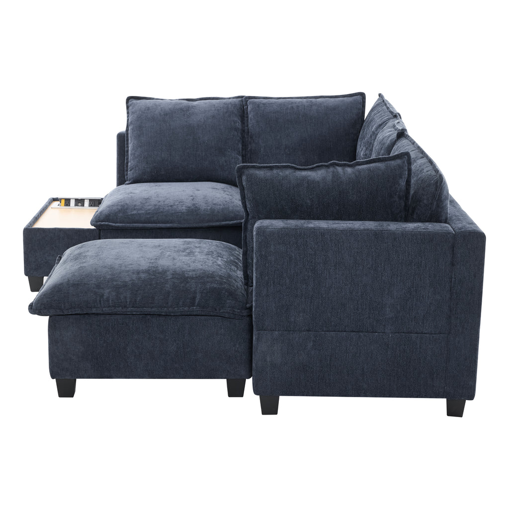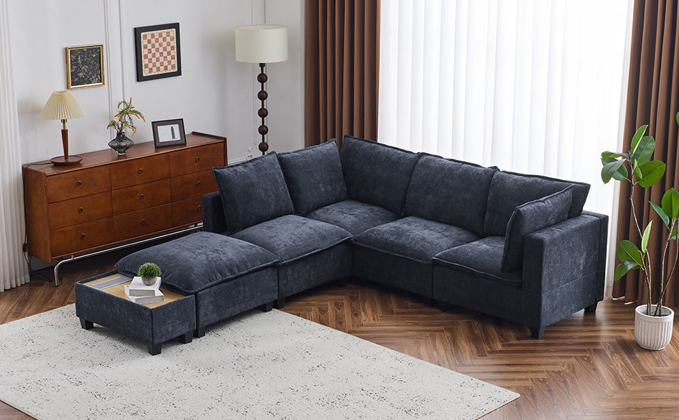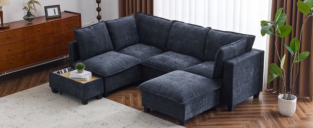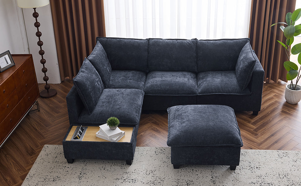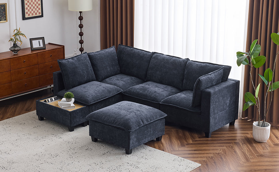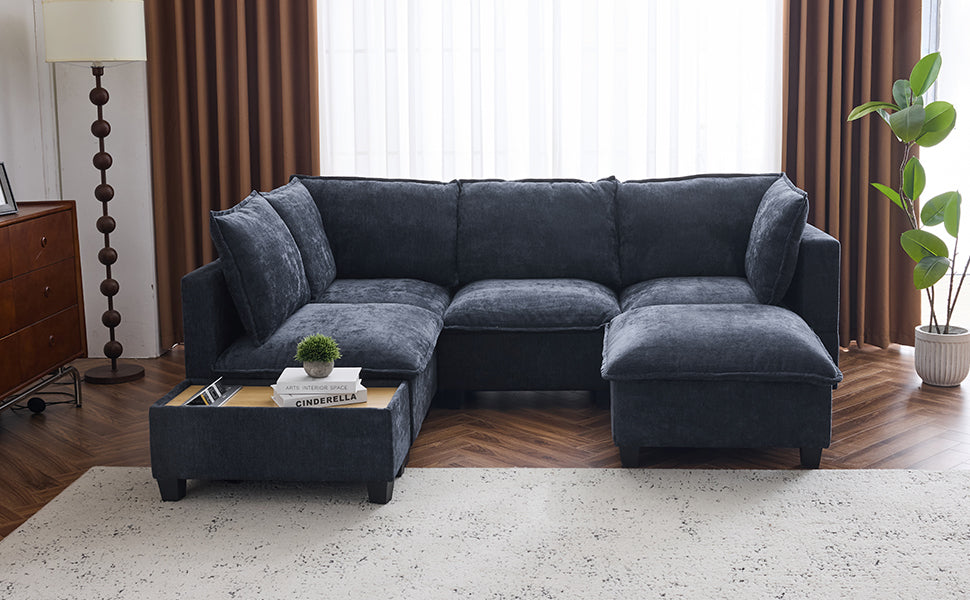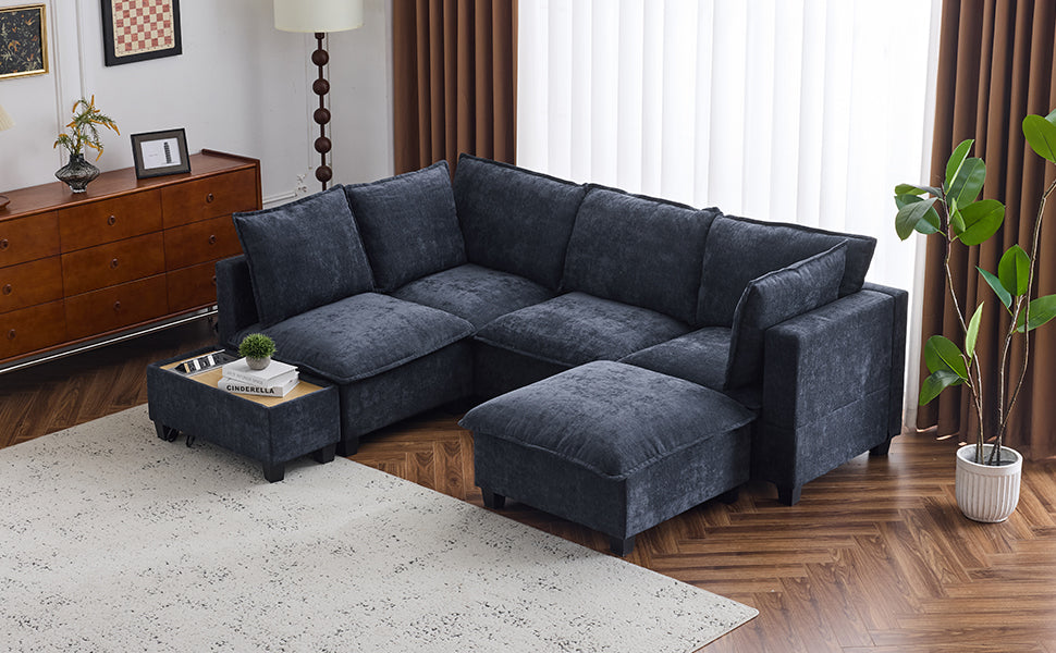 This sectional sofa combines style, comfort, and functionality to elevate any living space. With its free configurations, you can effortlessly reconfigure it into a U-shaped or L-shaped layout by moving the ottoman and coffee table, making it ideal for gatherings, movie nights, or intimate settings. The versatile coffee table doubles as both an ottoman and a side table, offering flexibility to hold snacks, drinks, or even act as a footrest. Equipped with hidden charging devices, the coffee table includes a discreet, built-in charging port that can be concealed when not in use, protecting it from water splashes and maintaining a sleek look. The sectional’s high-density foam cushions provide optimal comfort and support, ensuring a perfect balance of softness and firmness. Its long-lasting durability ensures it remains in like-new condition, preserving both its style and functionality for years to come. This sofa is a perfect blend of modern design and practical features, adapting seamlessly to your lifestyle and space.
