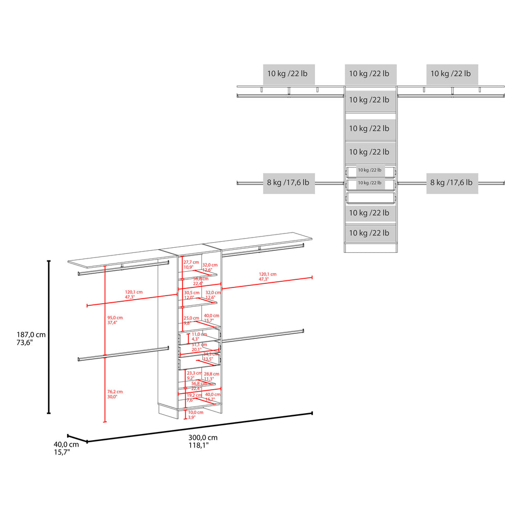 - Modular Design – Customizable system with hanging rods, open shelves, and drawers for versatile storage.