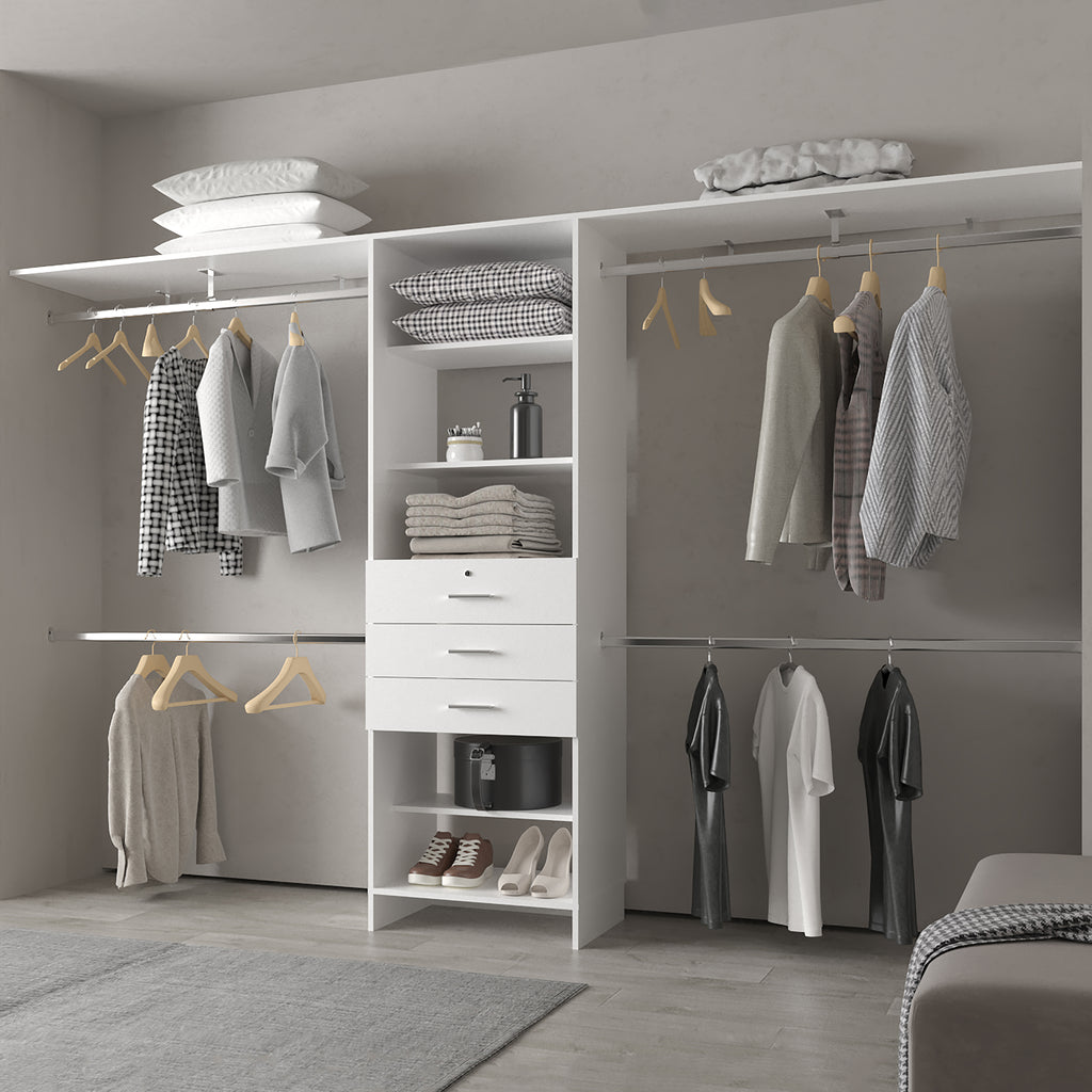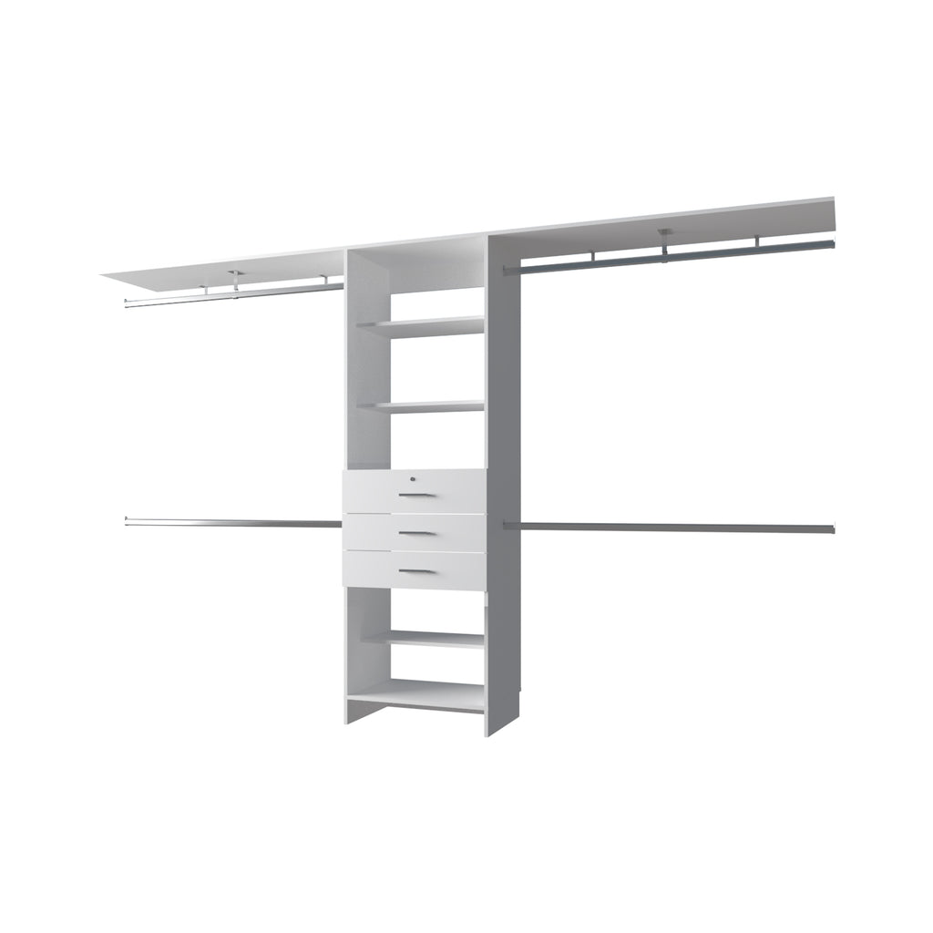 Upgrade your storage space with this versatile Modular Closet Organizer System, designed to maximize efficiency in walk-in closets, bedrooms, or wardrobe areas. Featuring multiple hanging rods, this system allows you to store both short and long garments with ease. The central shelving unit provides ample space for folded clothes, accessories, or decorative items, while three spacious drawers offer discreet storage fo