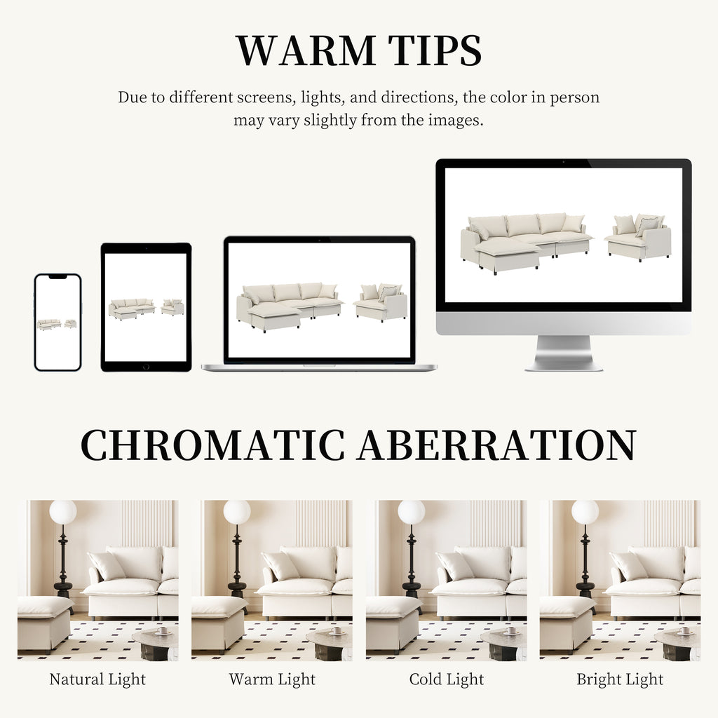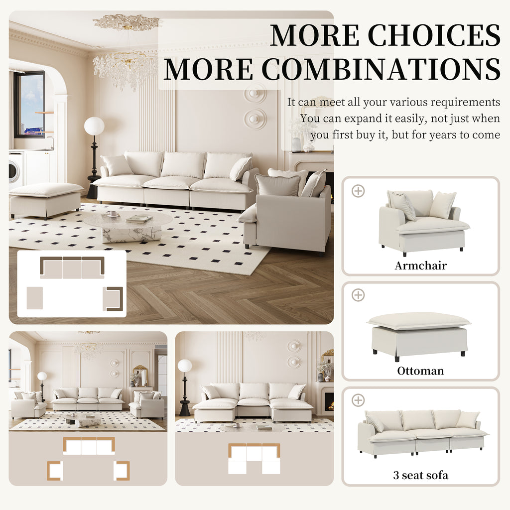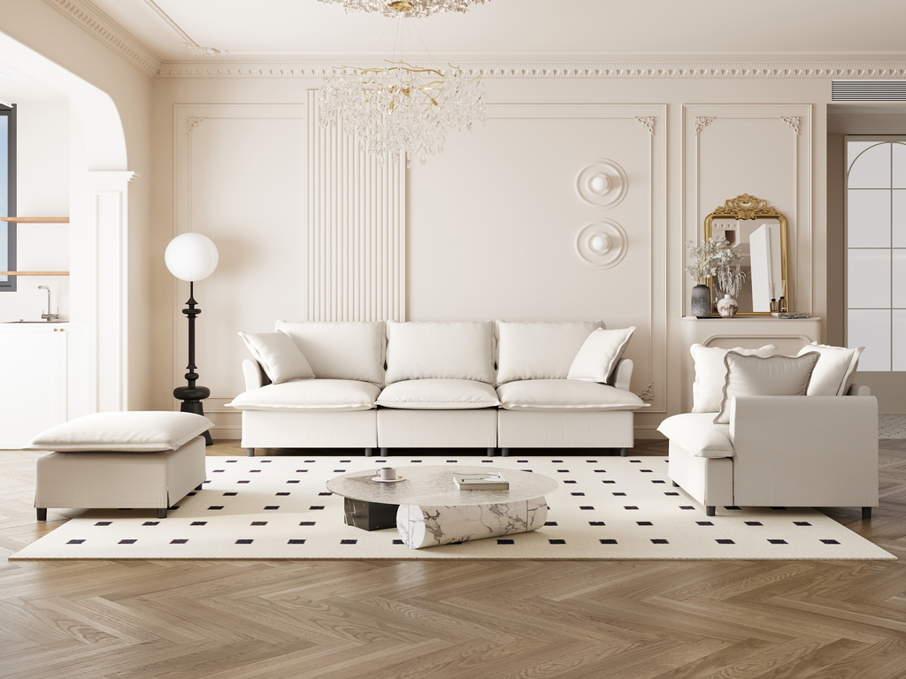 Discover endless possibilities with our modular sofa! Featuring three movable modules—three-seater, single seat, and ottoman—you can easily customize the layout to fit any space. Need more? Simply purchase additional modules as needed. Perfect for various room sizes and interior styles, its elegant skirted seat design and petal-shaped armrests bring a touch of sophistication to your home. Enjoy versatile, stylish comfort with our adaptable, modular design!