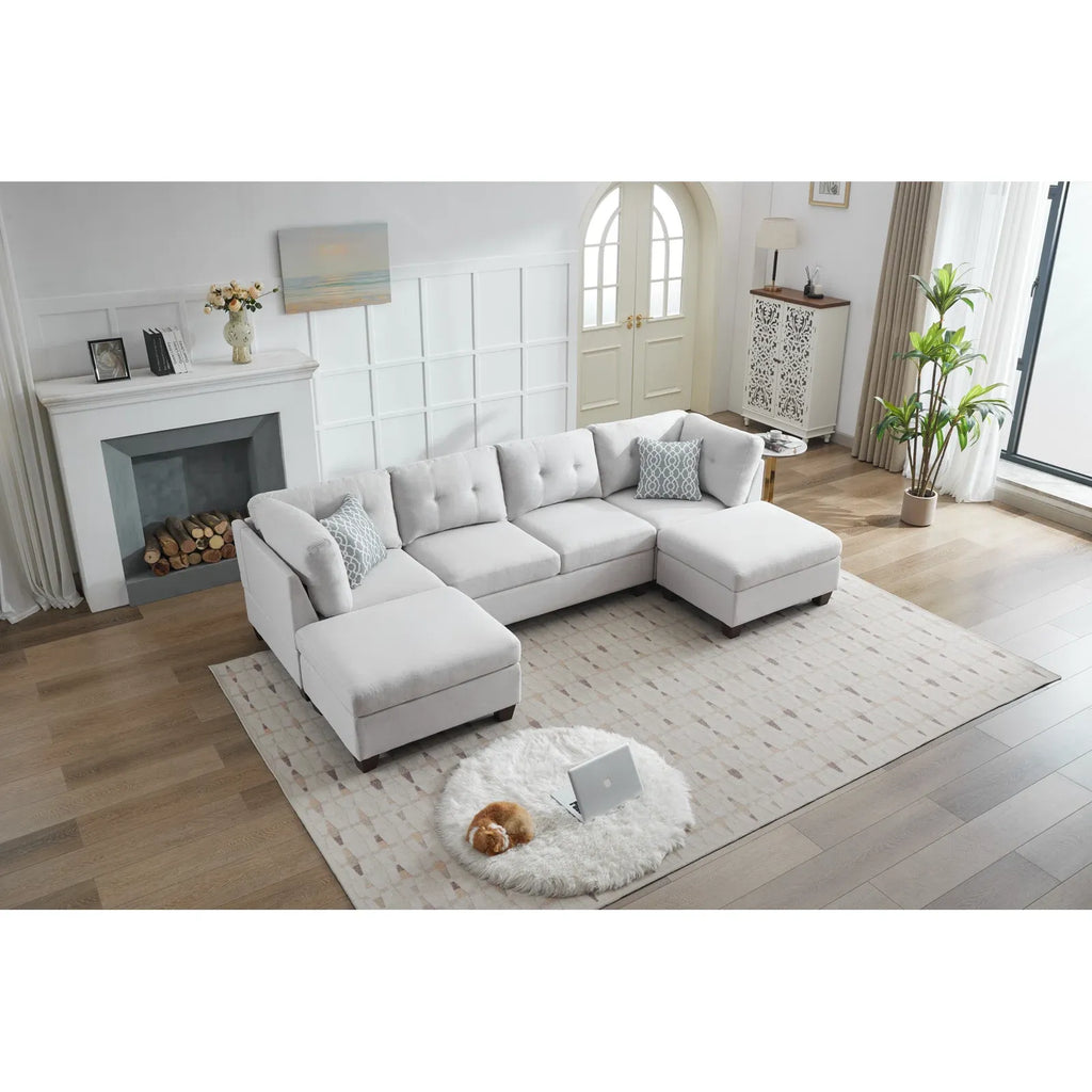 - Upholstered Modular Sectional Sofa Featuring Dual Chaise Lounges, Button - Tufted Backrests and Decorative Throw Pillows
