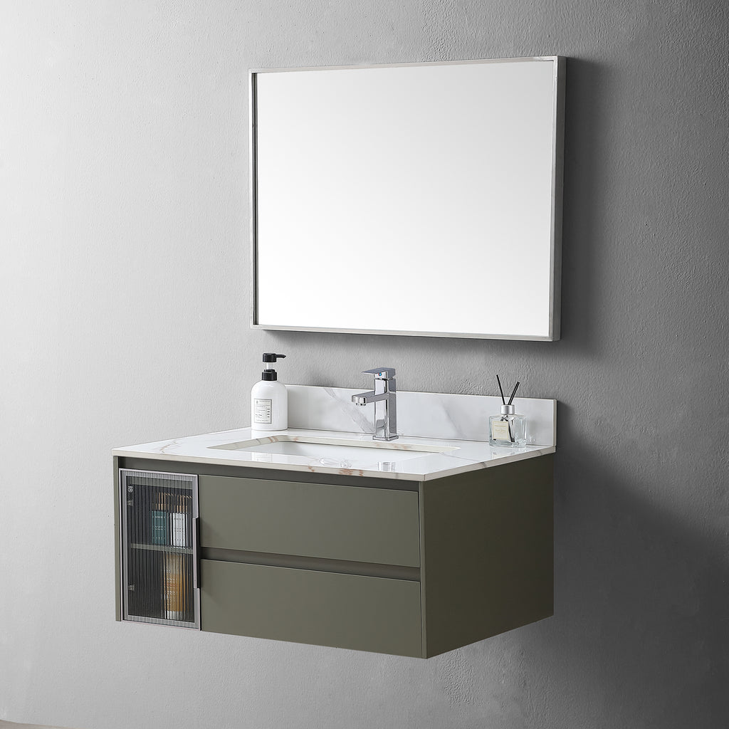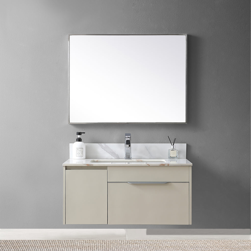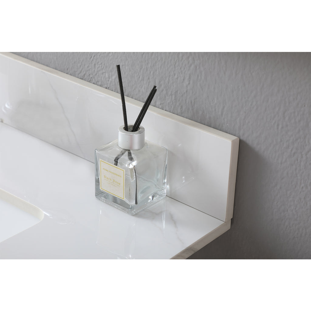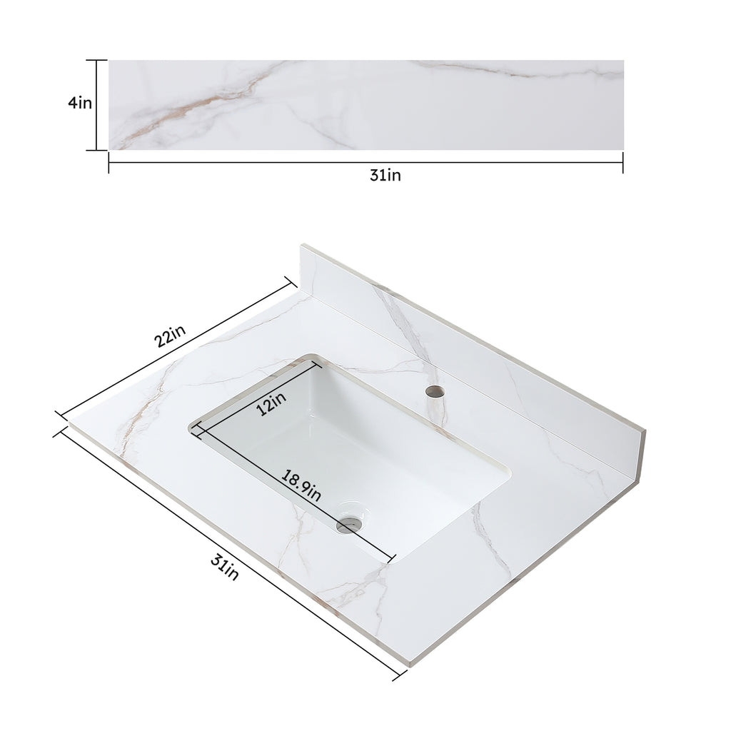 - The vanity tops are made of beautiful sintered stone. All exterior sides are polished for a luxurious look. Each model is complemented with a ceramic Rectangle undermount sink. The matching backsplash is included in each package.